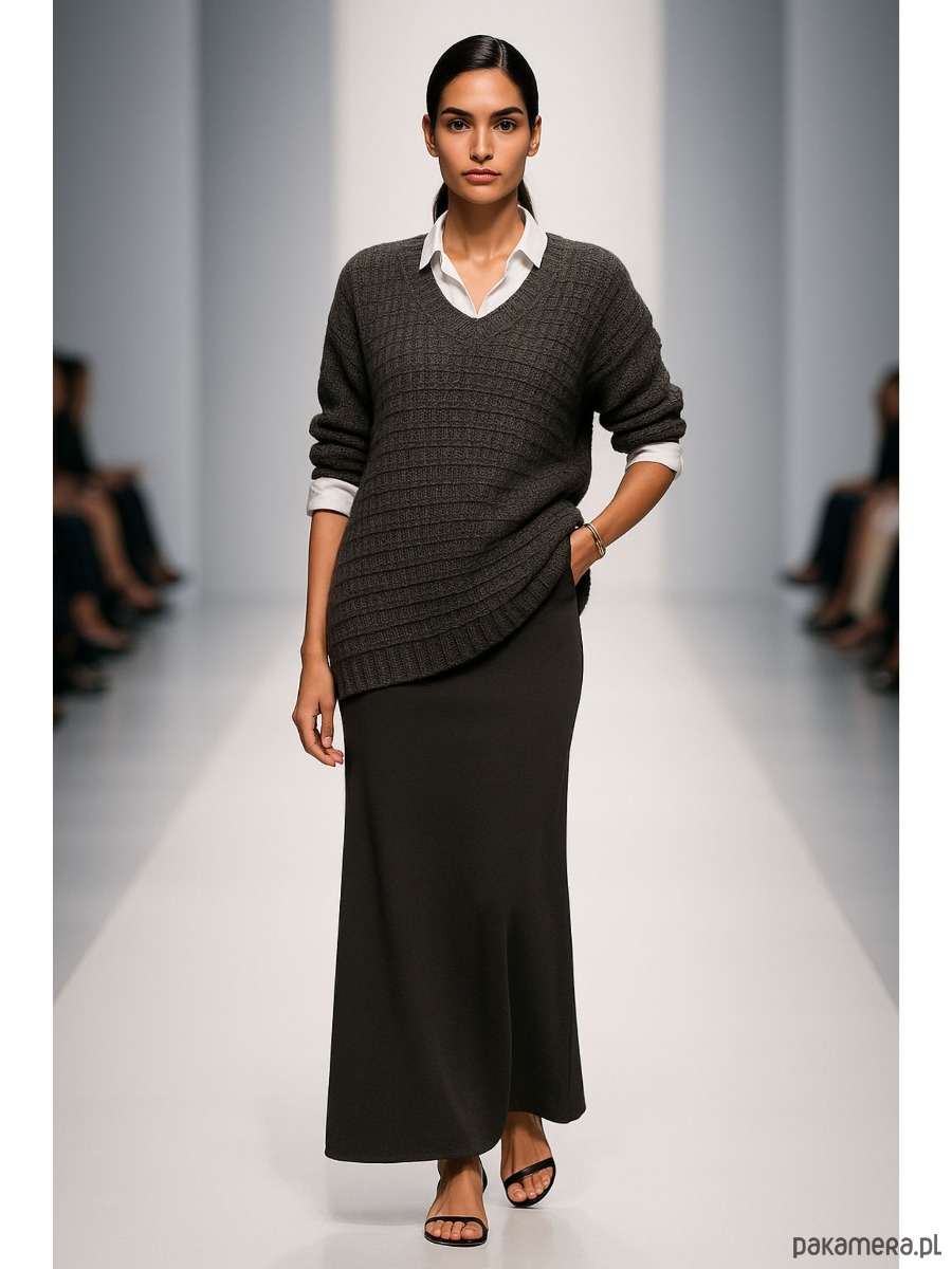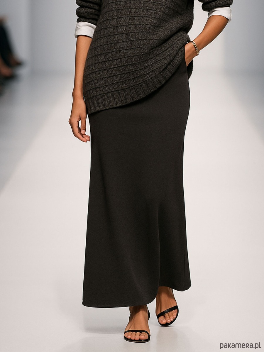 Spódnica o kroju trapezu; dopasowana na biodrach, rozszerzana ku dołowi; biodrówka; szeroki pasek. Fason do pracy, na co dzień i na wieczór. Wykonana z naturalnej przewiewnej dzianiny. Kolor spódnicy: grafitowy RAL7043. Długość całkowita: 100 cm. Dzianina naturalna: 95% wiskoza, 5% elastyn. Pranie ręczne lub w pralce w temp. 30 stopni; suszenie w stanie rozwieszonym, prasowanie parą.