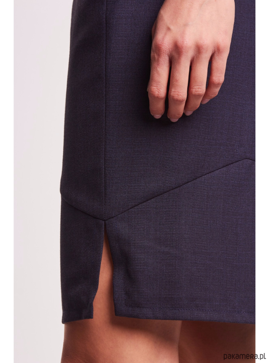 Spódnica ołówkowa wykonana z wysokiej jakości granatowej tkaniny, z oryginalnym, ukośnym cięciem na dole, które podkreśla jej nowoczesny charakter. Zapinana na kryty zamek z boku. Wykończona elegancką, czarną podszewką z domieszką elastanu. Krój optycznie wysmuklający sylwetkę.