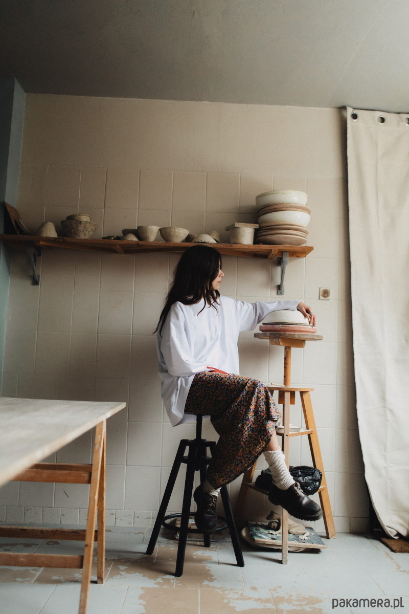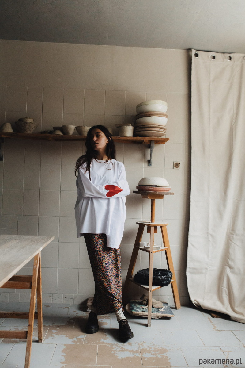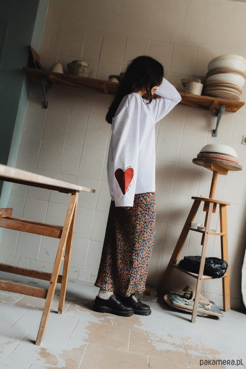 Model został uszyty ręcznie przez Panią Małgosię z materiału II gatunku – 100% wiskozy. Na wewnętrznej stronie tkaniny występują drobne niedoskonałości- przebarwienia, będące naturalnym śladem jej historii. Przebarwienia w żadnym stopniu nie wpływają na efekt wizualny oraz jakościowy produktu.