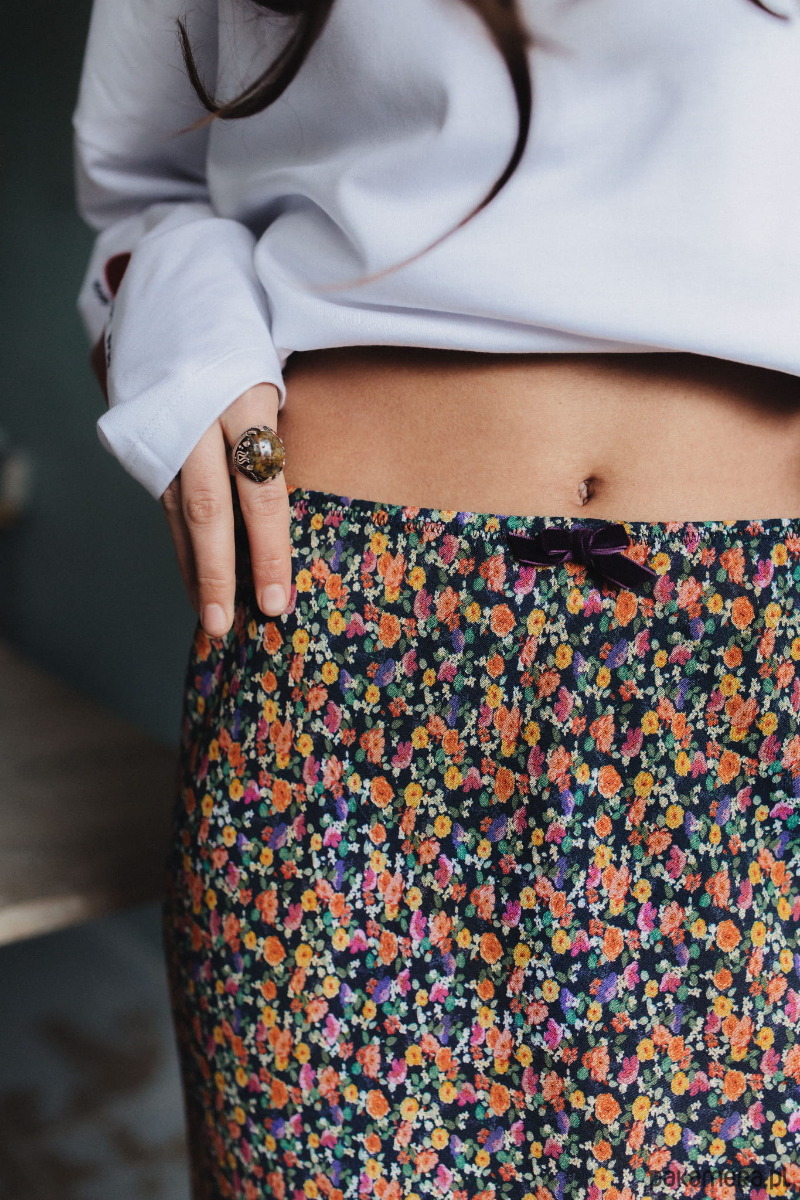 Spódnica ma bardzo uniwersalny, ponadczasowy krój. Jest lekka, miękko układa się na sylwetce i została wykończona cienką gumką w pasie oraz uroczą, aksamitną kokardką, która dodaje jej dziewczęcego charakteru.
