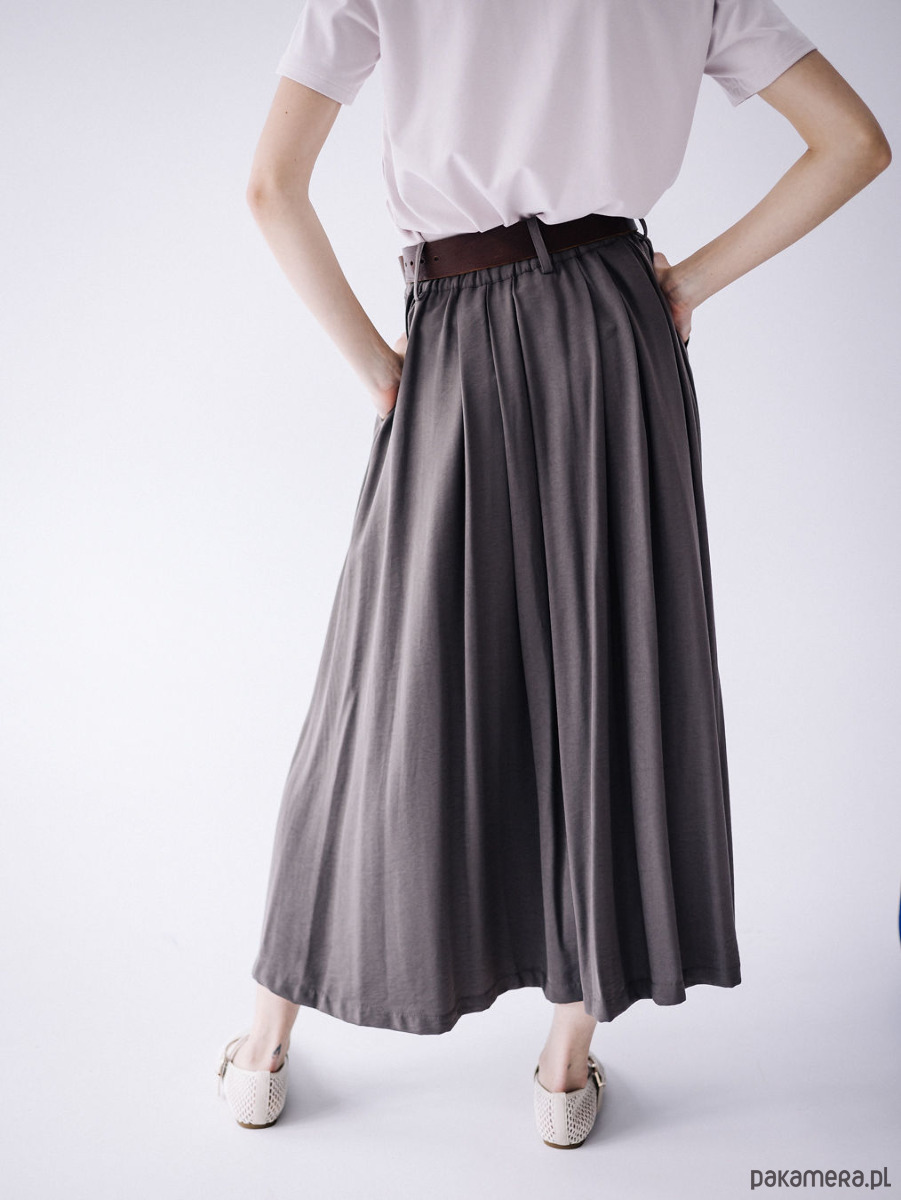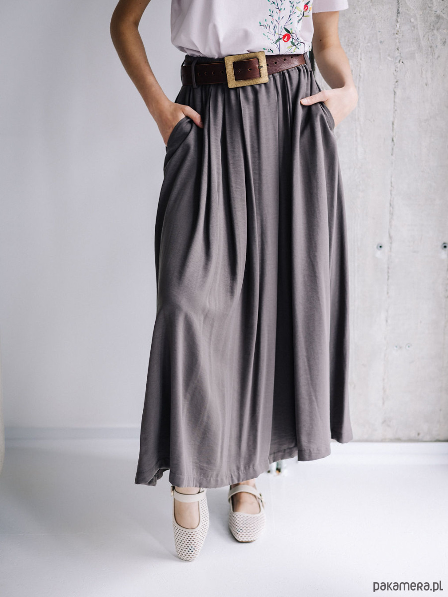 Spódnica, która tańczy przy każdym kroku. Uszyta z wyjątkowo przyjemnej w noszeniu tkaniny – połączenia rayonu (85%) i nylonu (15%) – dzięki czemu jest lekka, oddychająca i subtelnie połyskuje w świetle.