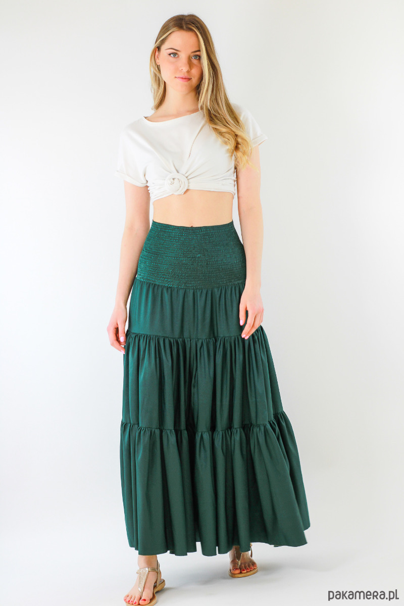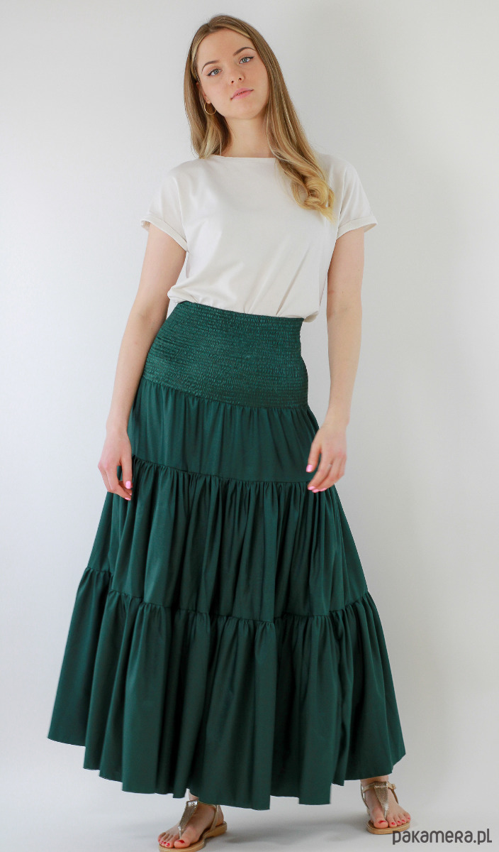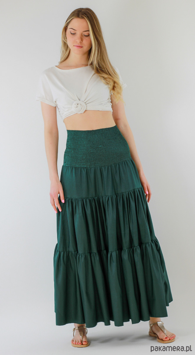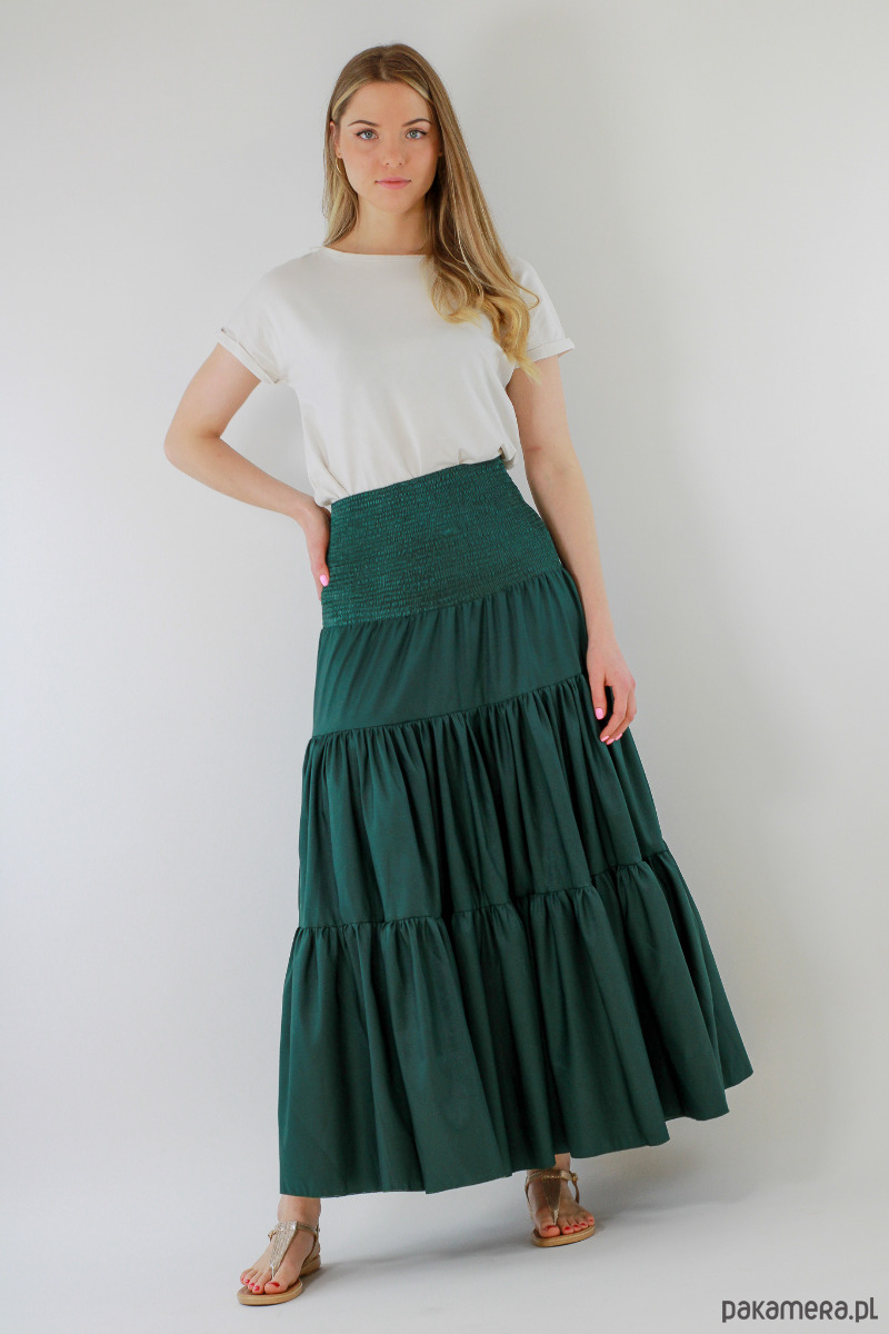 Zwiewna spódnica boho maxi długa w kolorze butelkowa zieleń z falbanami. Spódniczka uszyta ze satyny z bardzo dużej ilości tkaniny. Dzięki temu zyskuje bardzo oryginalny kobiecy wygląd. Pas spódnicy został wykonany z elastycznych nici gumowych co wspaniale podkreśla talię lub niżej noszona biodra. Spódnica idealnie sprawdzi się do wszystkich letnich stylizacji. Wszystkie nasze ubrania szyjemy we własnej szwalni w Poznaniu.