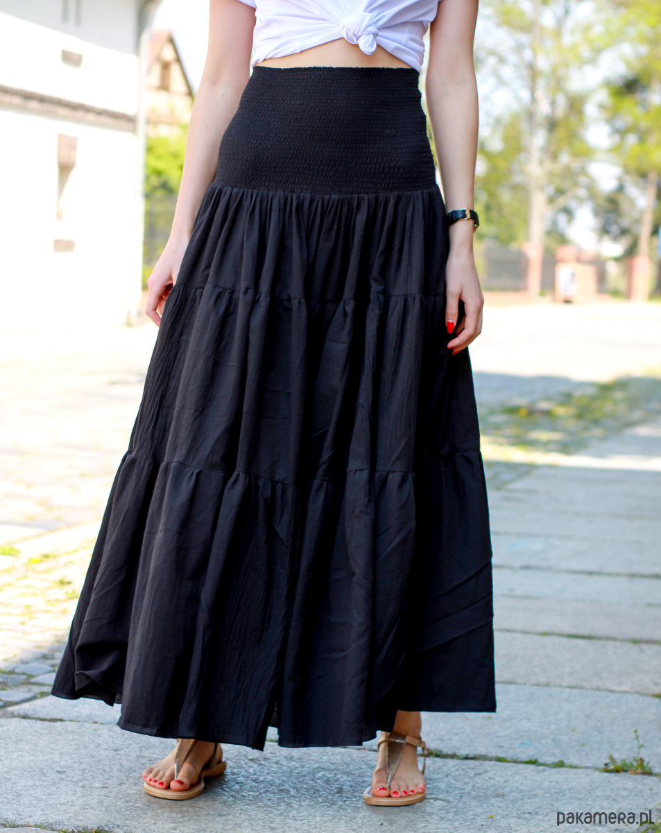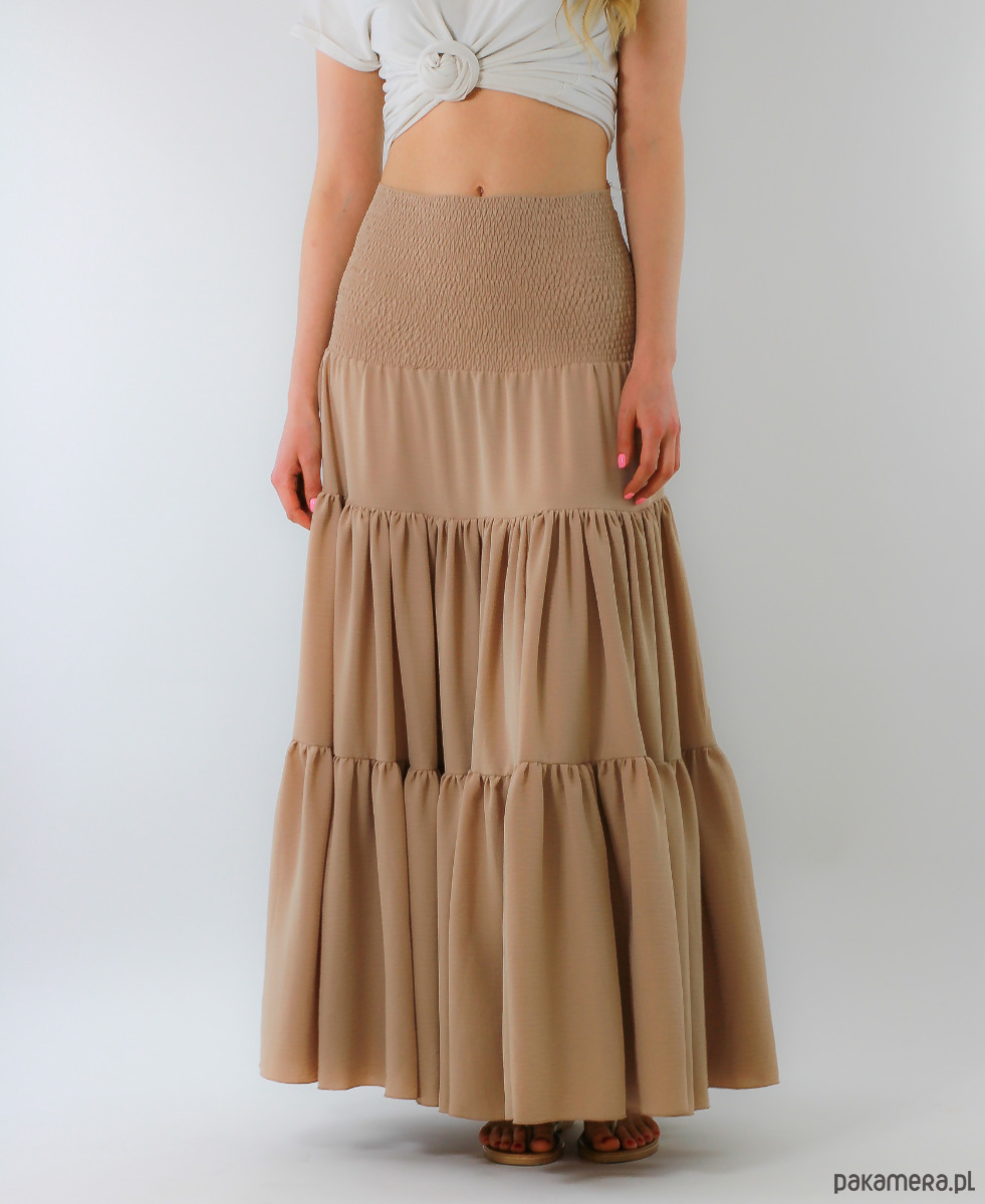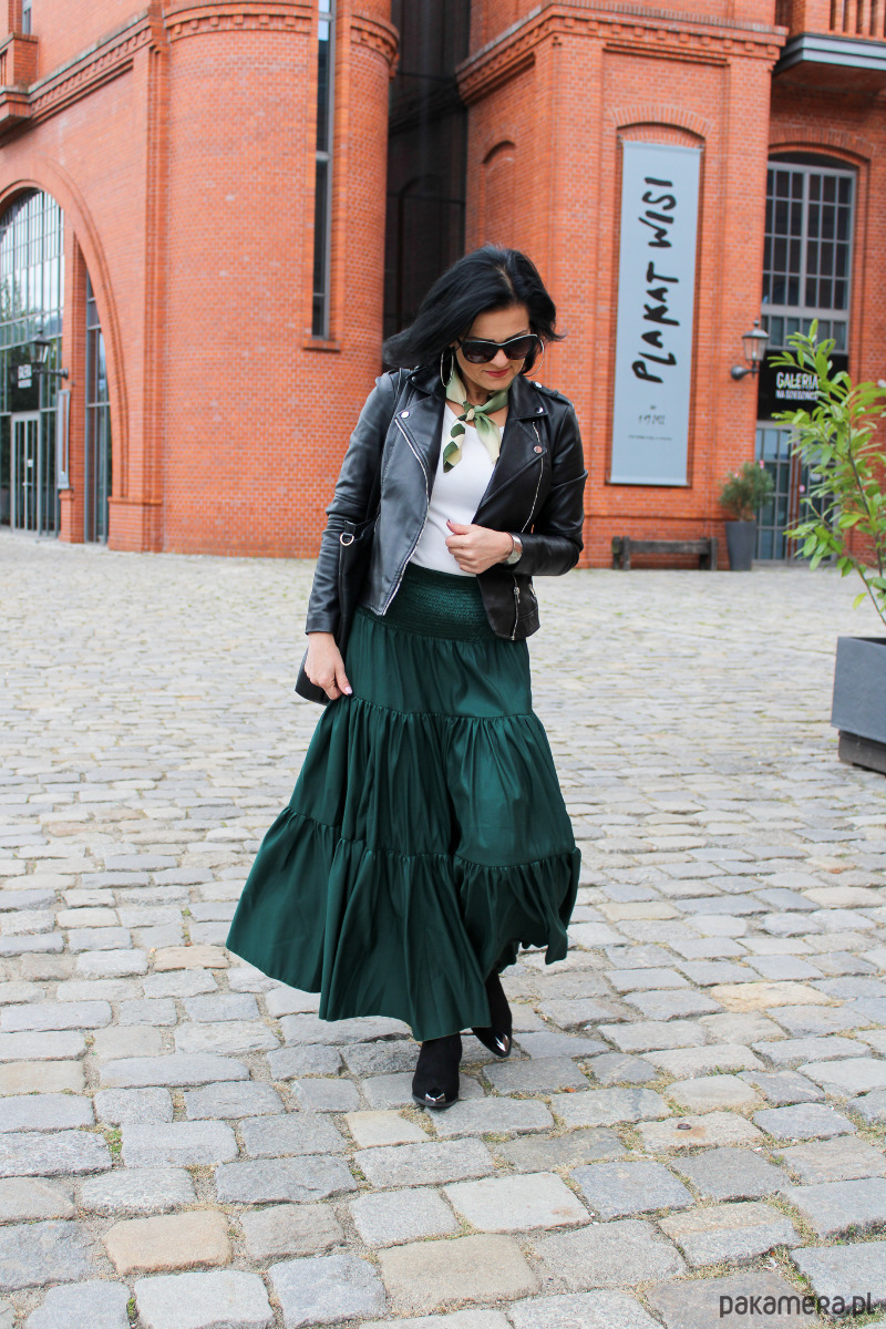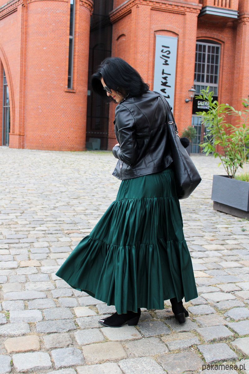 Zwiewna spódnica boho maxi długa w kolorze butelkowa zieleń z falbanami. Spódniczka uszyta ze satyny z bardzo dużej ilości tkaniny. Dzięki temu zyskuje bardzo oryginalny kobiecy wygląd. Pas spódnicy został wykonany z elastycznych nici gumowych co wspaniale podkreśla talię lub niżej noszona biodra. Spódnica idealnie sprawdzi się do wszystkich letnich stylizacji. Wszystkie nasze ubrania szyjemy we własnej szwalni w Poznaniu.