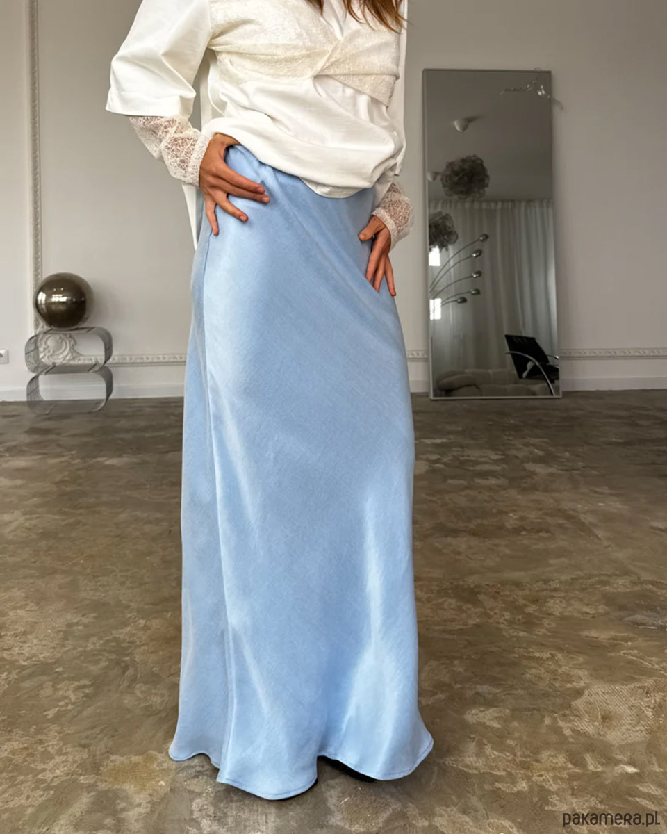 Tkanina ma delikatny połysk i przyjemną, lejącą strukturę, dzięki czemu spódnica pracuje z ruchem ciała i daje poczucie lekkości. Odcień sky blue wprowadza świeżość i spokój — jest subtelny, ale jednocześnie przyciąga uwagę i rozjaśnia stylizację.