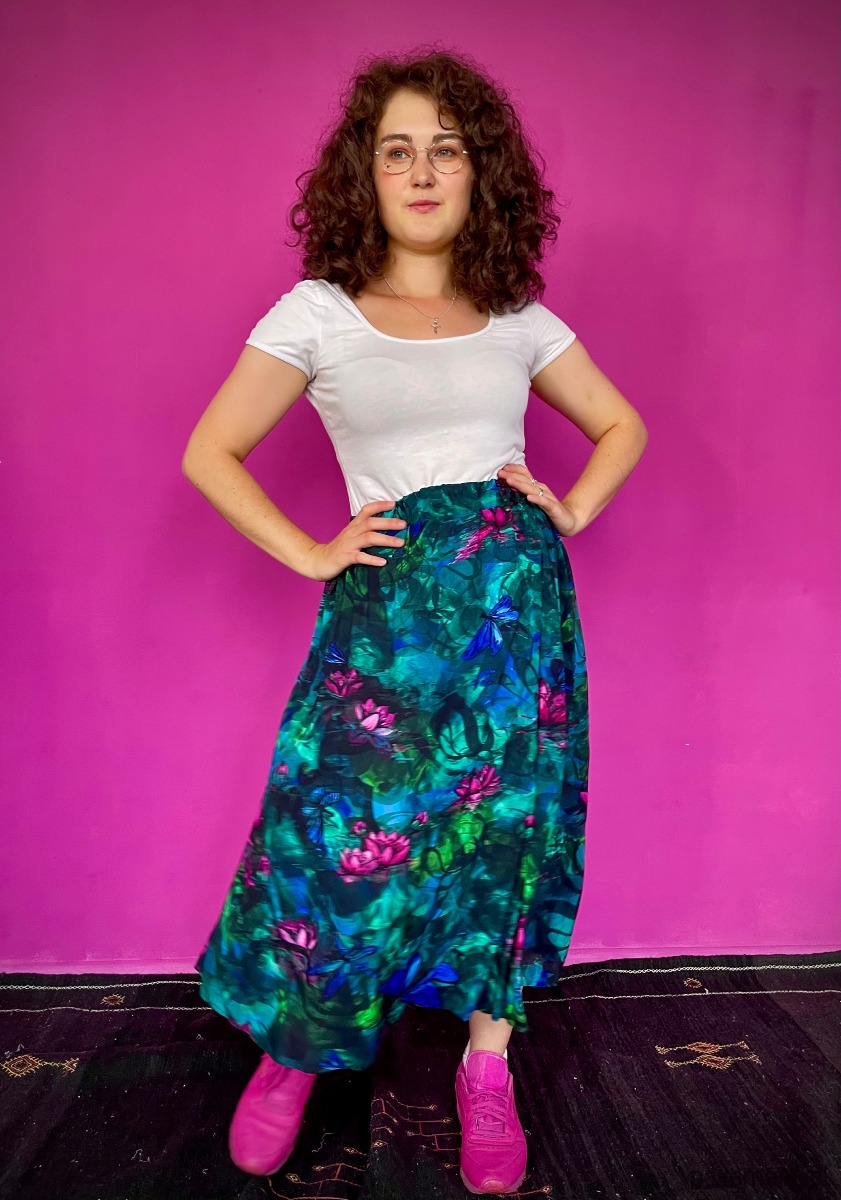 SPÓDNICA midi rozkloszowana na gumce, autorski print nenufary (100% wiskoza)