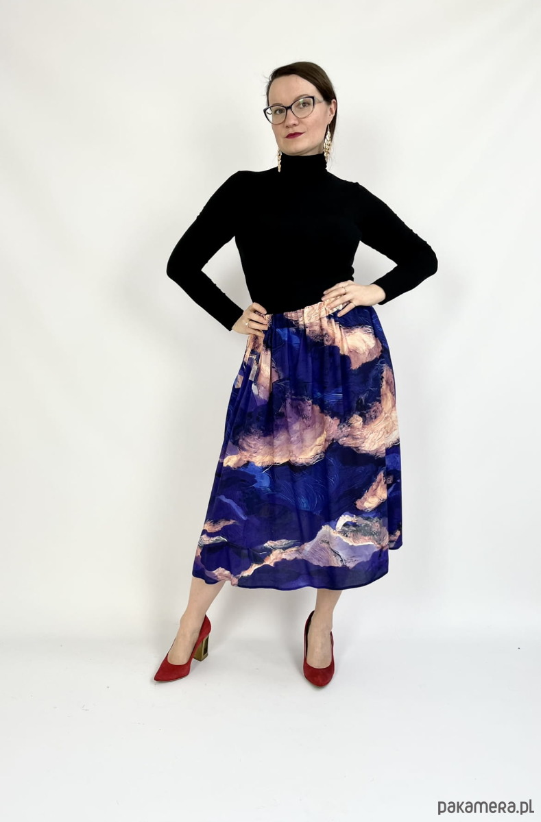 SPÓDNICA midi rozkloszowana na gumce, autorski print niebo (100% wiskoza)