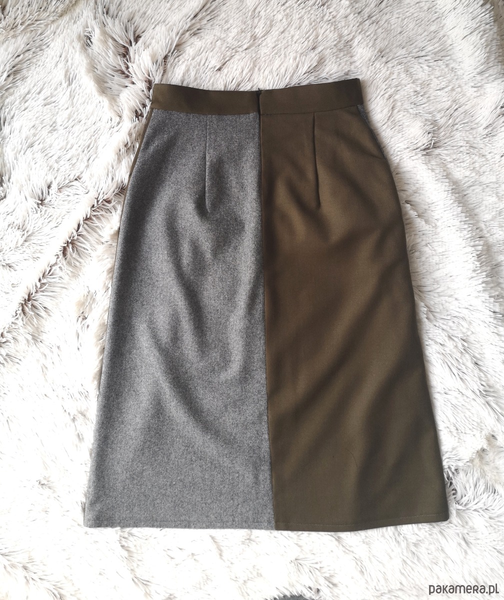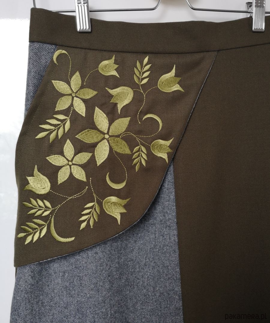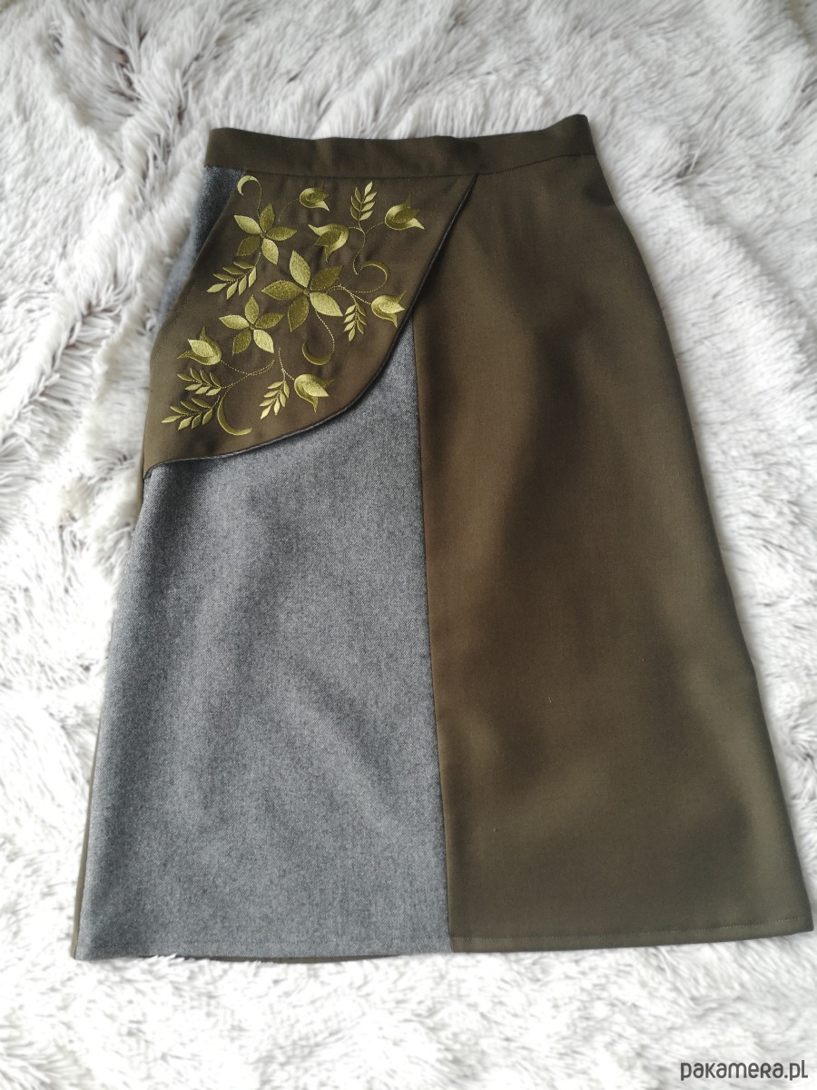 Spódnica midi o kroju A z łączonych tkanin wełnianych. Zieleń khaki oraz szarość, jako nieoczywiste połączenie oraz haftowana kieszeń zewnętrzna po prawej stronie. Autorski haft nawiązujący do słowiańskich korzeni, esów-floresów, natury oraz kwiatów ludowych. Nowoczesna forma naszej tradycji.