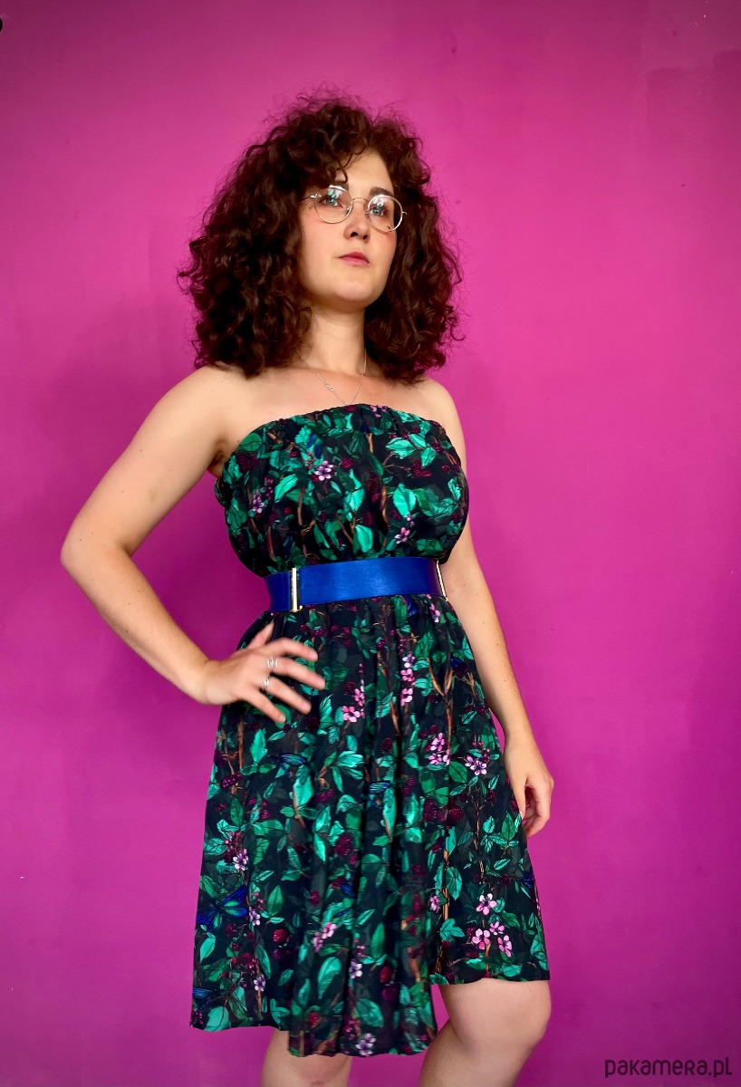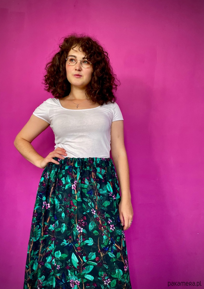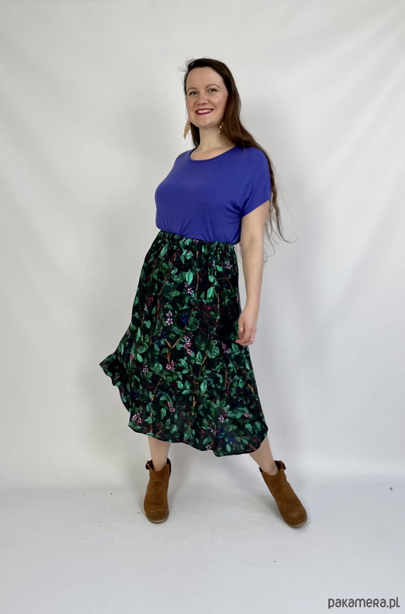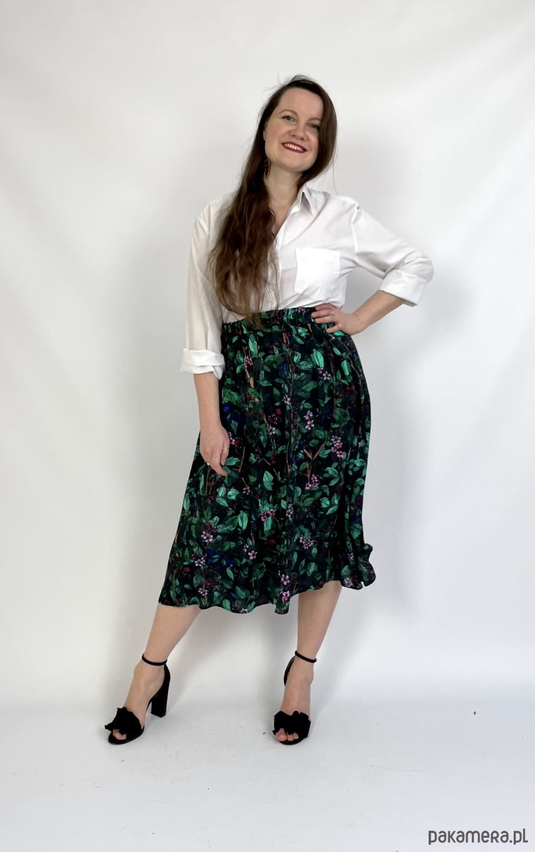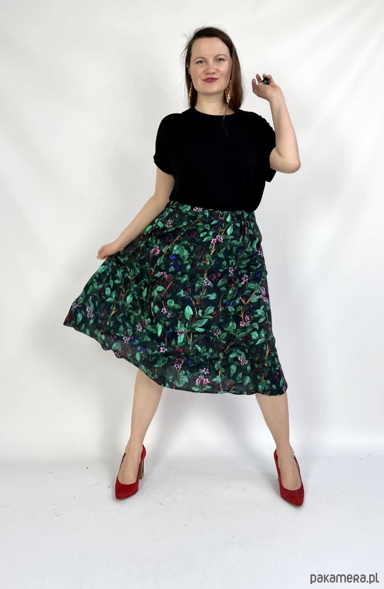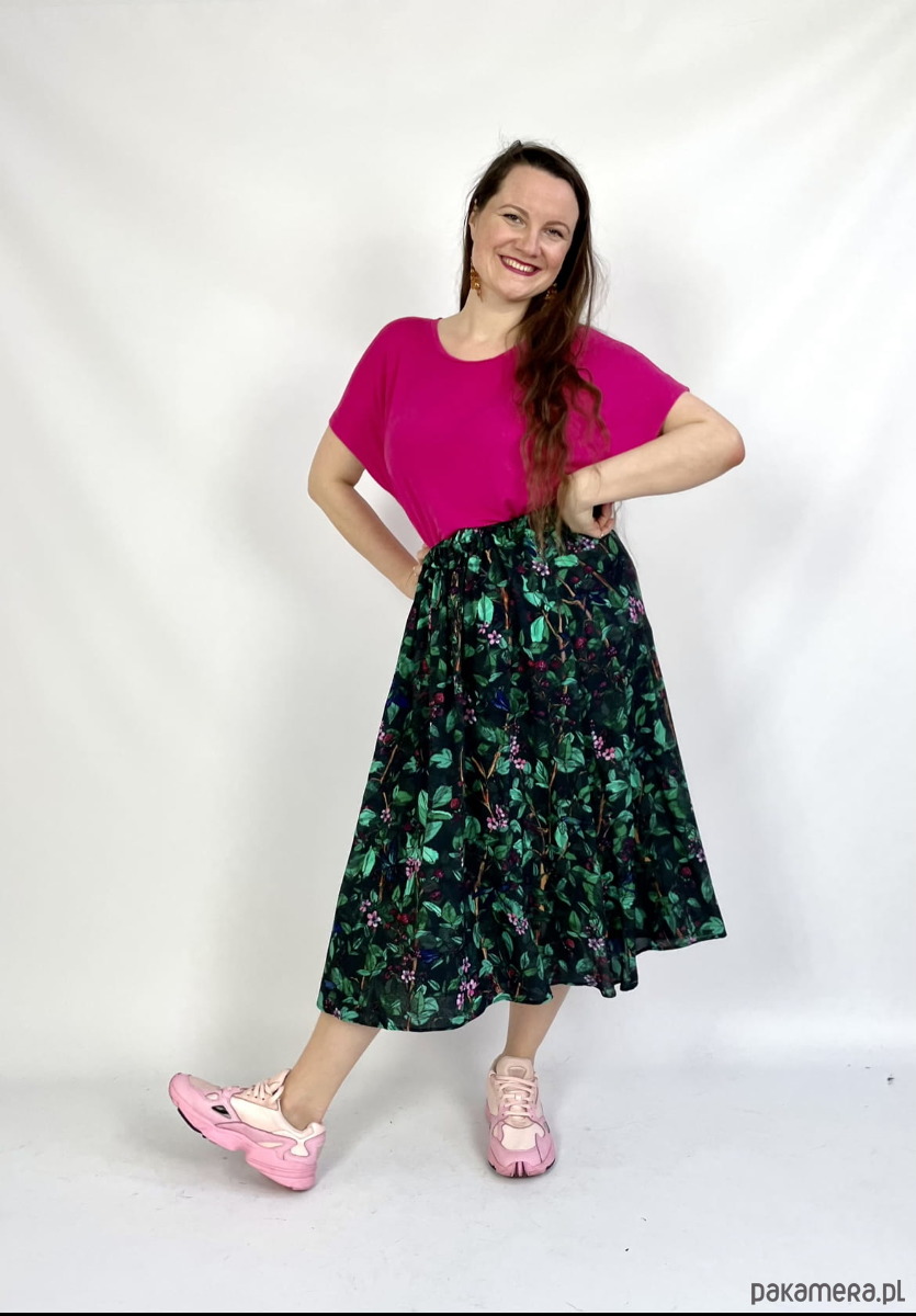 Rozkloszowany krój pięknie się kręci a głaszcząca skórę wiskoza otula Twoje ciało jak lekka chmurka tańcząc przy każdym kroku. A gumkę dopasujesz do swojej figury i podkreślisz talię.