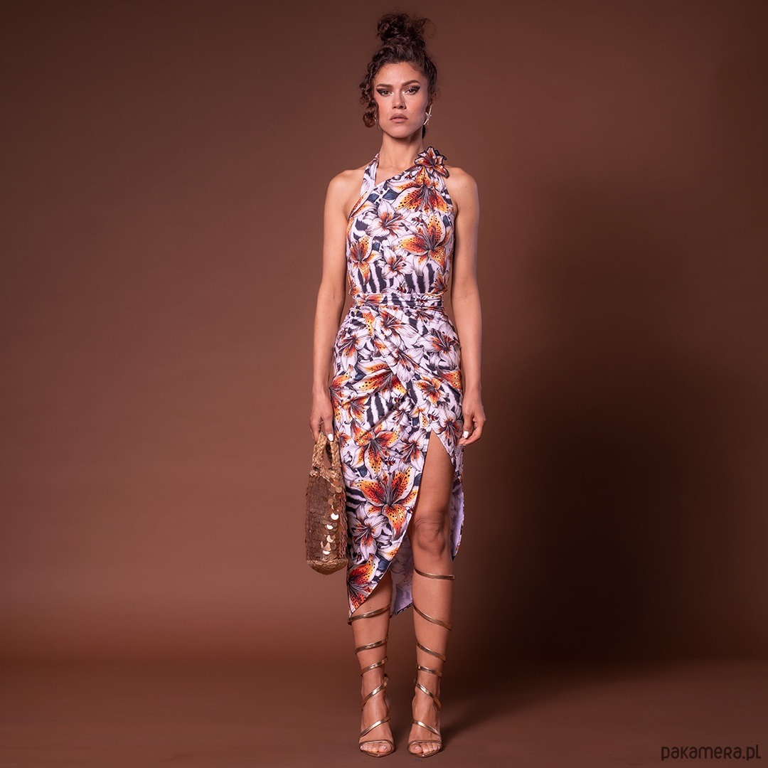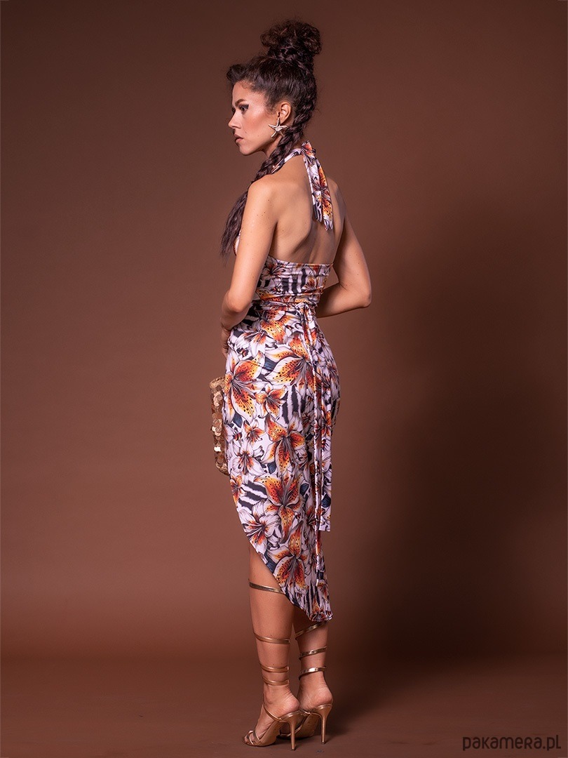 Ta spódnica jest jak udrapowane pareo, o kopertowym kroju i wiązaniem w talii, które idealnie dopasowuje się do sylwetki. Asymetryczny fason odsłania jedną nogę, możesz ją wiązać z przodu, z tyłu lub z boku.