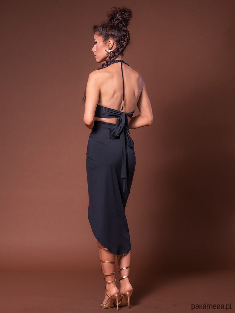 Ta spódnica jest jak udrapowane pareo, o kopertowym kroju i wiązaniem w talii, które idealnie dopasowuje się do sylwetki. Asymetryczny fason odsłania jedną nogę, możesz ją wiązać z przodu, z tyłu lub z boku.
