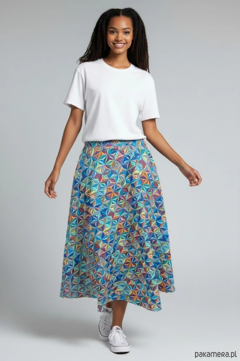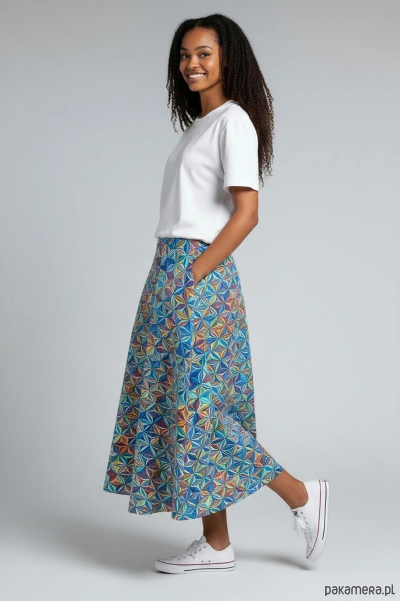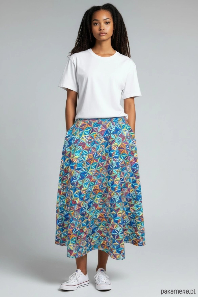 Wyjątkowa spódnica Purosza to propozycja dla kobiet, które lubią kolor, wygodę i unikatowe projekty. Ten model wyróżnia się intensywnym, geometrycznym wzorem, który przyciąga uwagę i nadaje stylizacji energii oraz nowoczesnego charakteru.