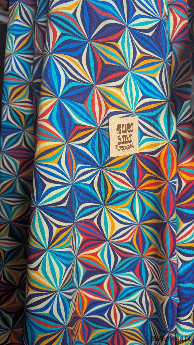 Wzór tworzą powtarzalne, hipnotyzujące układy przypominające kalejdoskop – zbudowane z drobnych, promienistych form. Dominują tu odcienie niebieskiego, turkusu i granatu, przełamane akcentami żółci, czerwieni, pomarańczu i bieli. Całość daje efekt dynamicznej, optycznej mozaiki, która pięknie pracuje w ruchu.