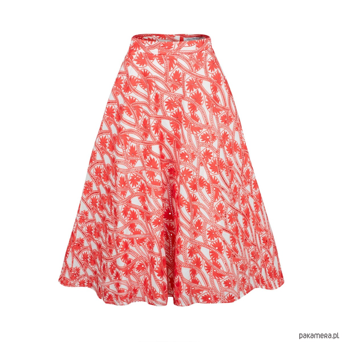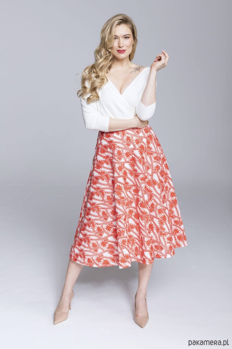 randiflora – inaczej: Milin – to pomarańczowo-czerwone kwiaty, gęstym ornamentem kwitnące nad morzem śródziemnym. Haft angielski inspirowany tymi kwiatami zdobi całą spódnicę. Grecka bawełna z haftem jest zamaszysta, lekko usztywniona, z nuta etniczną i przecudownie układająca się w ruchu. Z tej tkaniny możesz zamówić także inne projekty z pracowni projektantki!