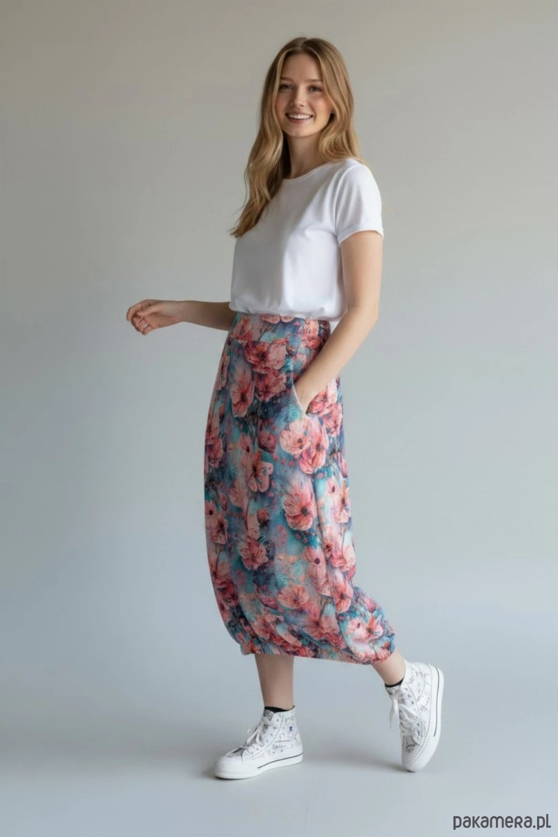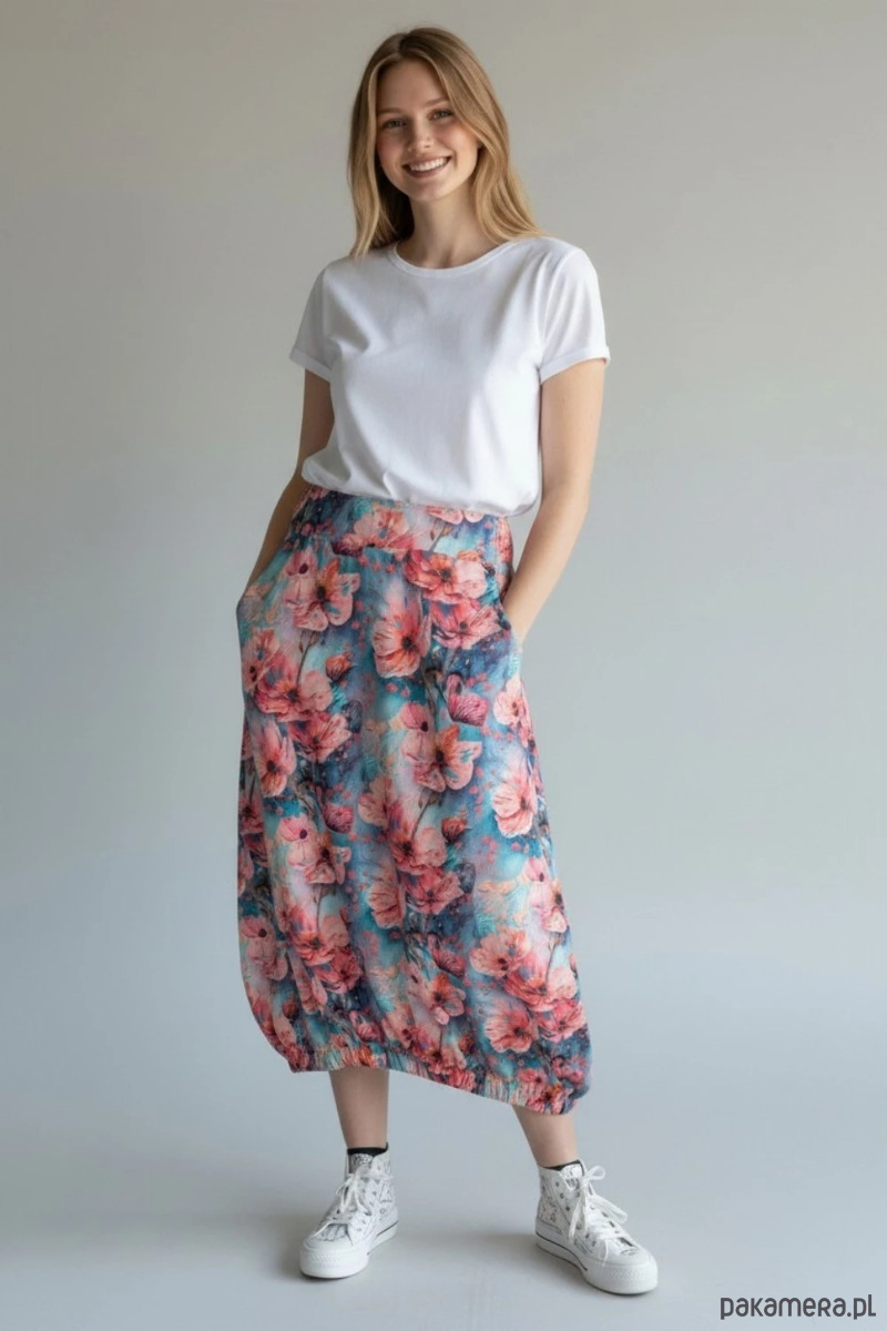 Wyjątkowa spódnica Samsara w efektowny wzór różowych maków, która łączy wygodę z artystycznym, wyrazistym stylem. To model dla osób, które lubią kolor, oryginalność i ubrania z charakterem.