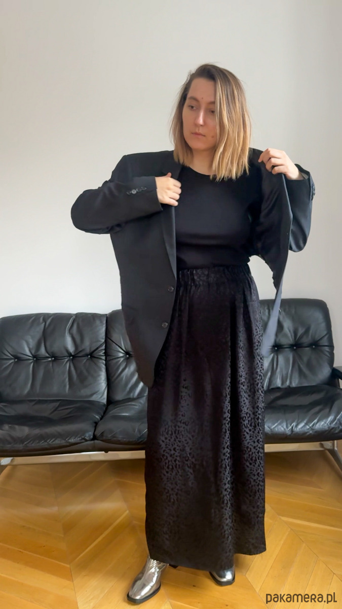 Długość maxi oraz elastyczna guma w pasie sprawiają, że spódnica dopasowuje się do sylwetki i jest komfortowa w noszeniu. To projekt balansujący między klasyką a subtelną drapieżnością.