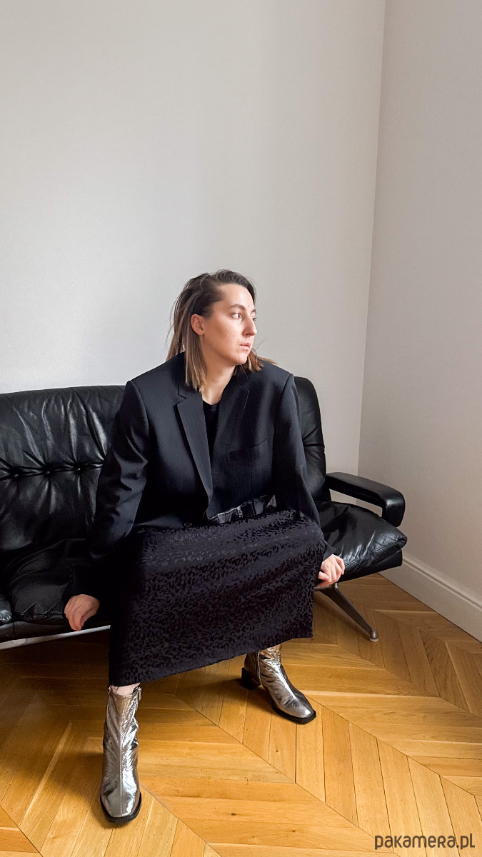 Shadow Panther Skirt to spódnica, w której wzór pozostaje dyskretny, a charakter buduje się w detalu. Uszyłam ją z materiału w czarną panterkę z drugiego obiegu, który nadaje całości głębi i tekstury.