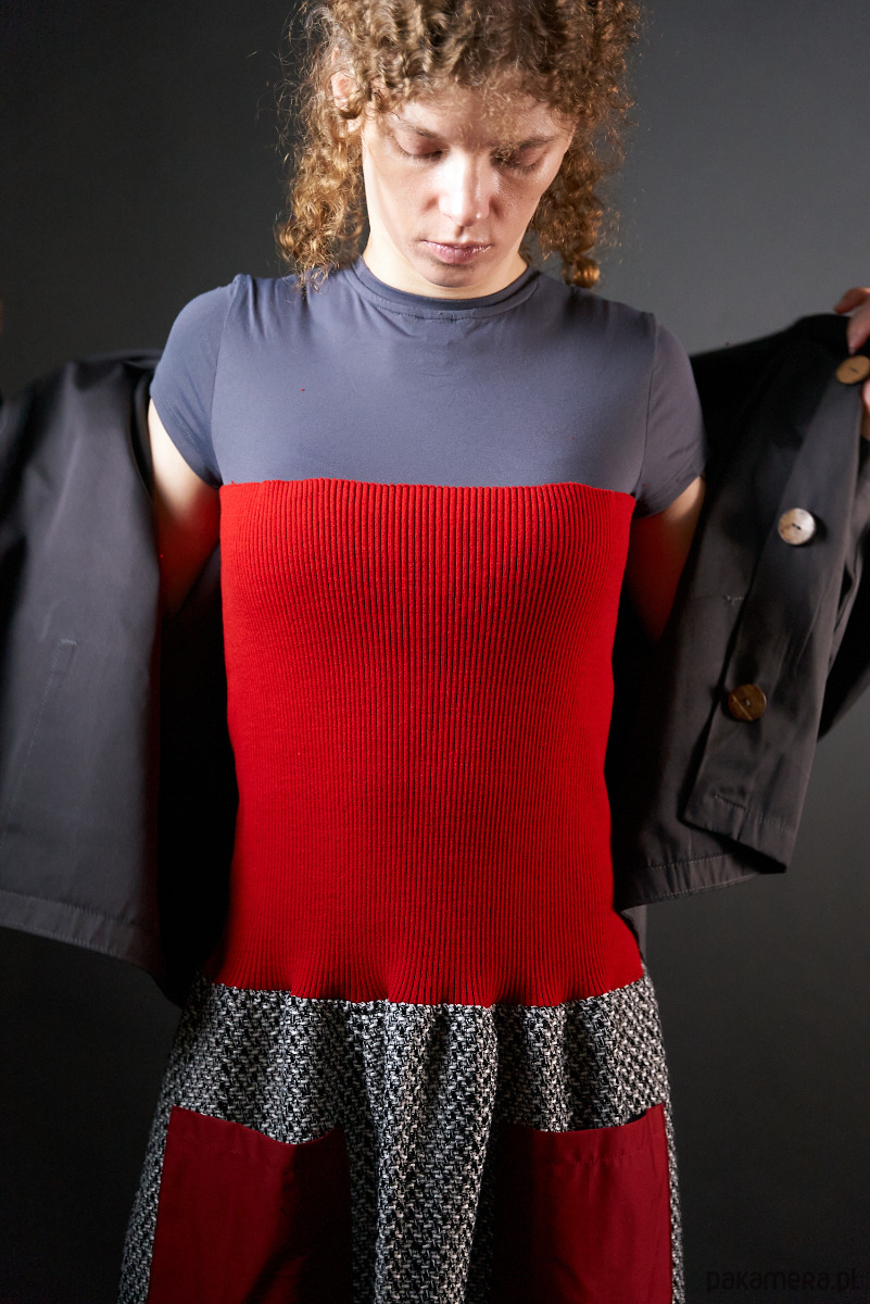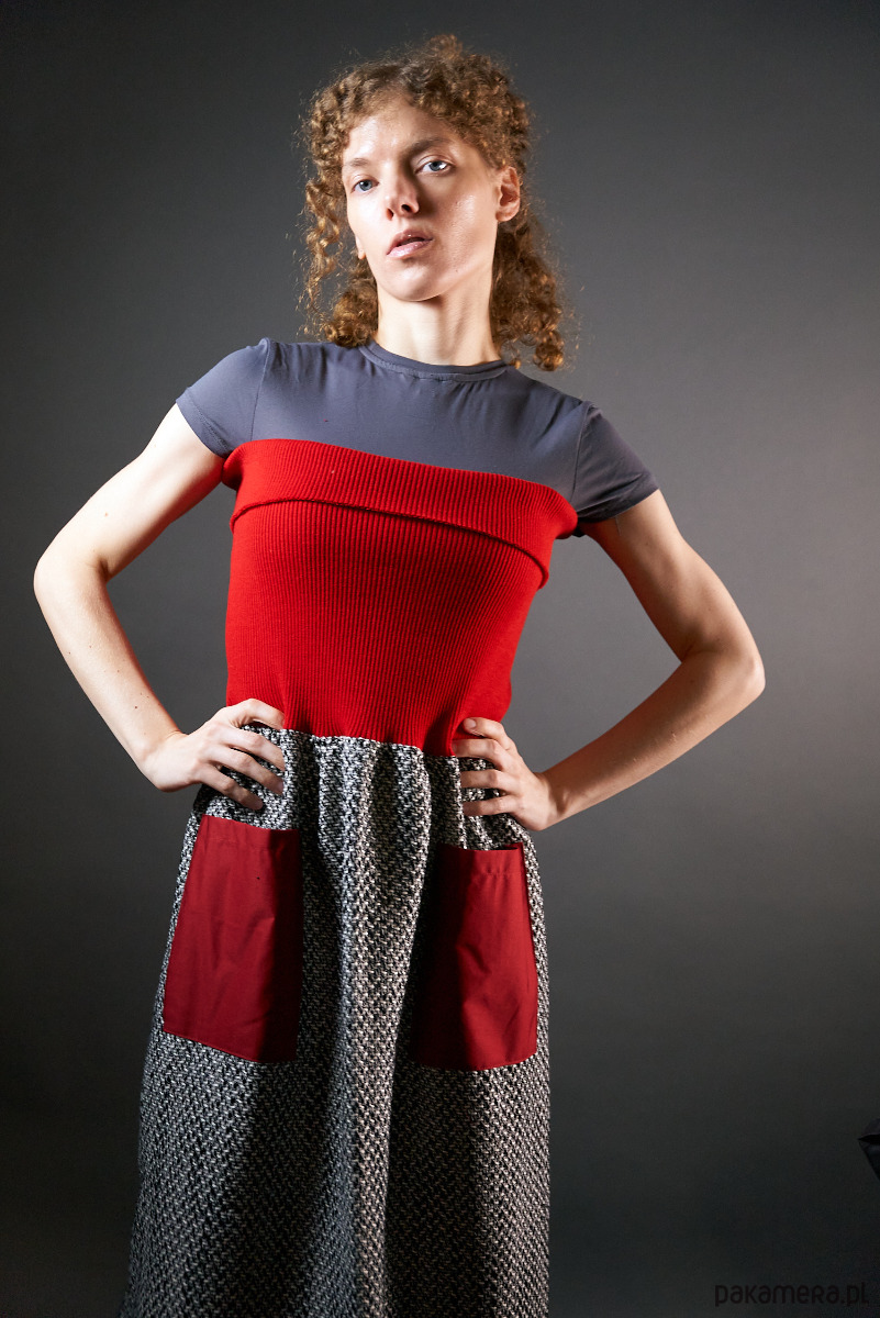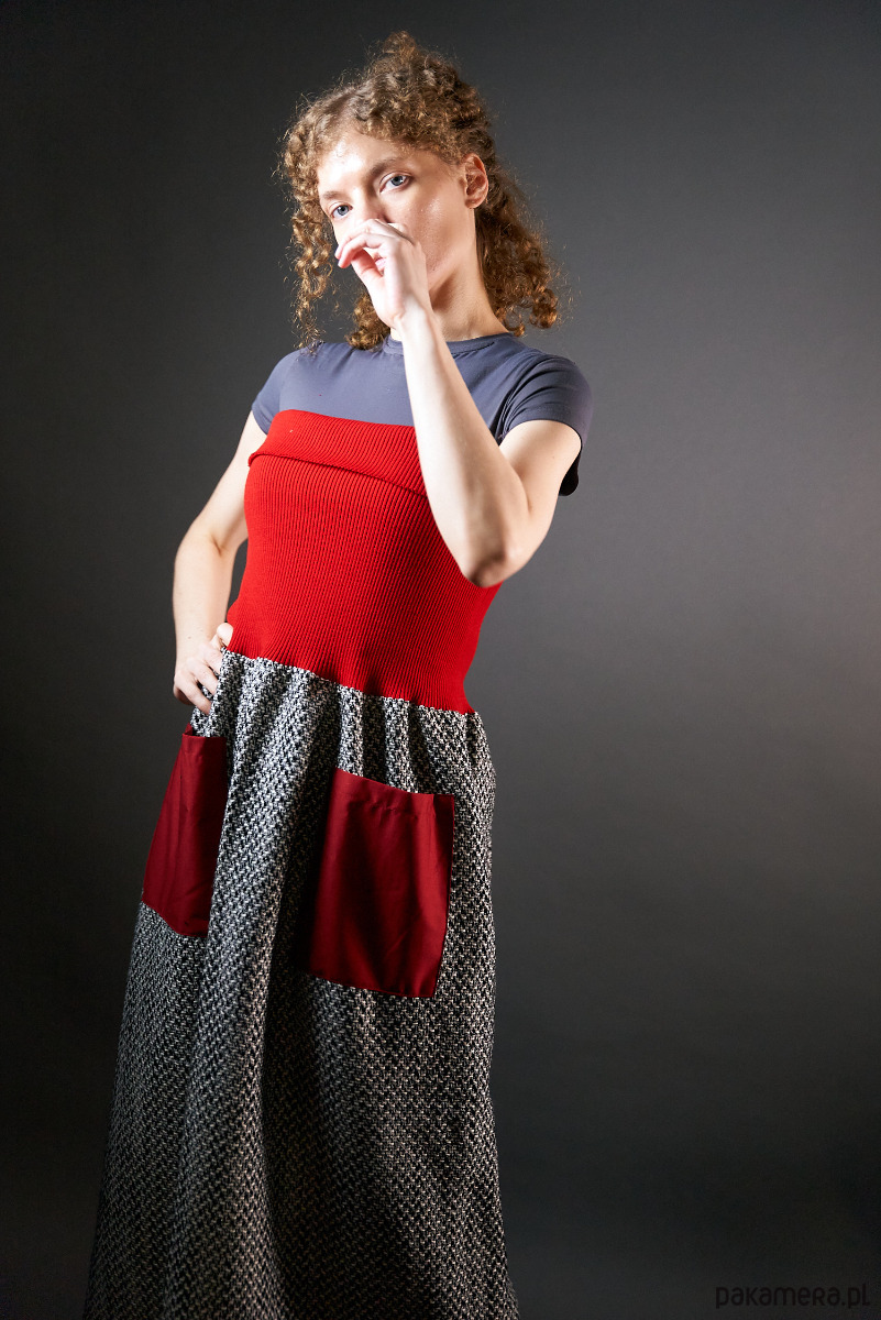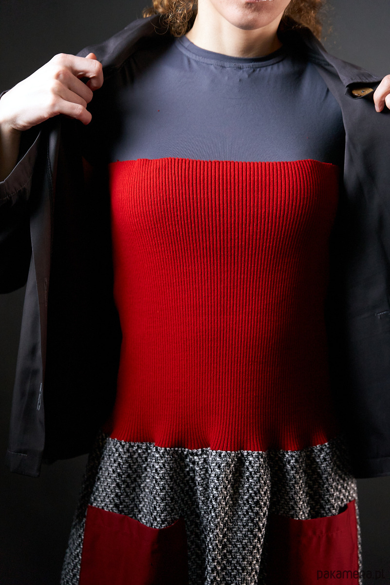 Czarno-biała spódnica -sukienka z długim czerwonym ściągaczem.