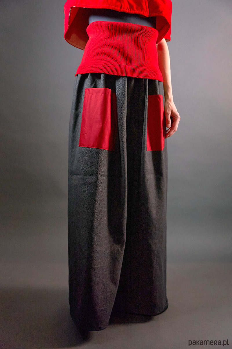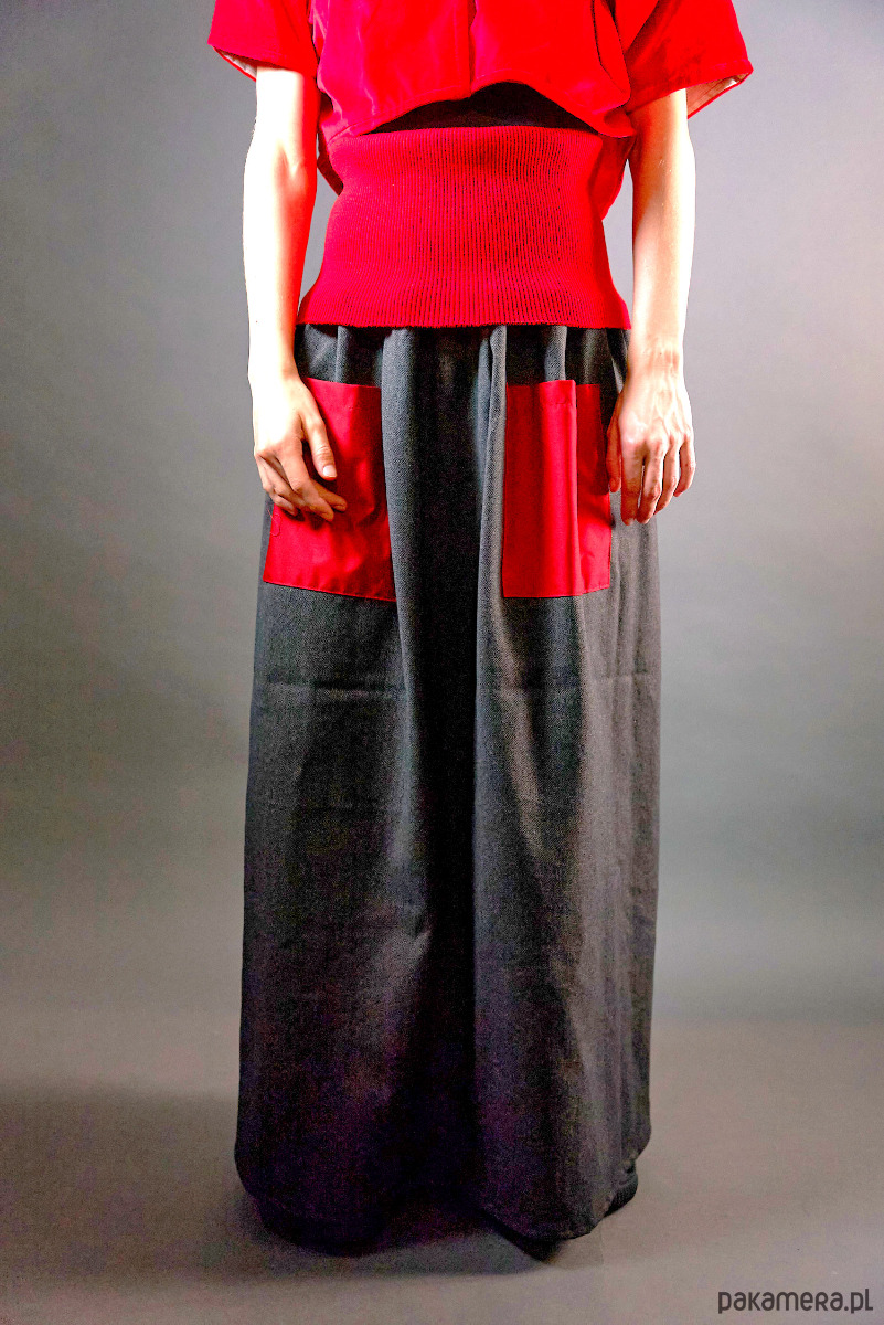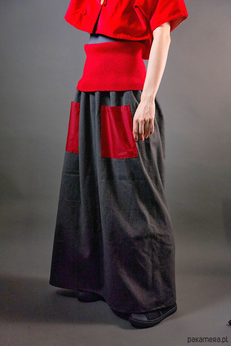 Spódnica -sukienka z bawełnianego tweedu z długim czerwonym ściągaczem.