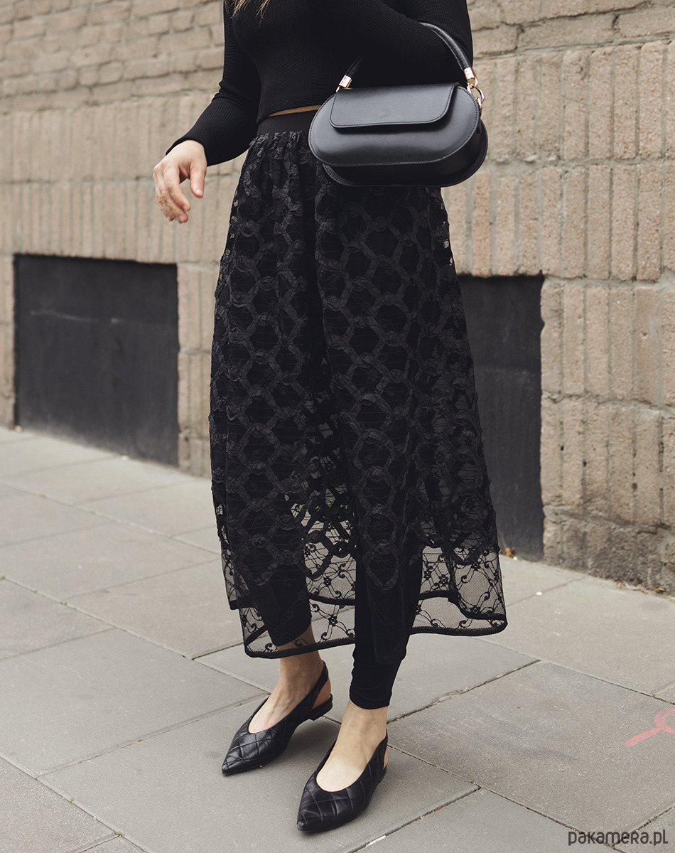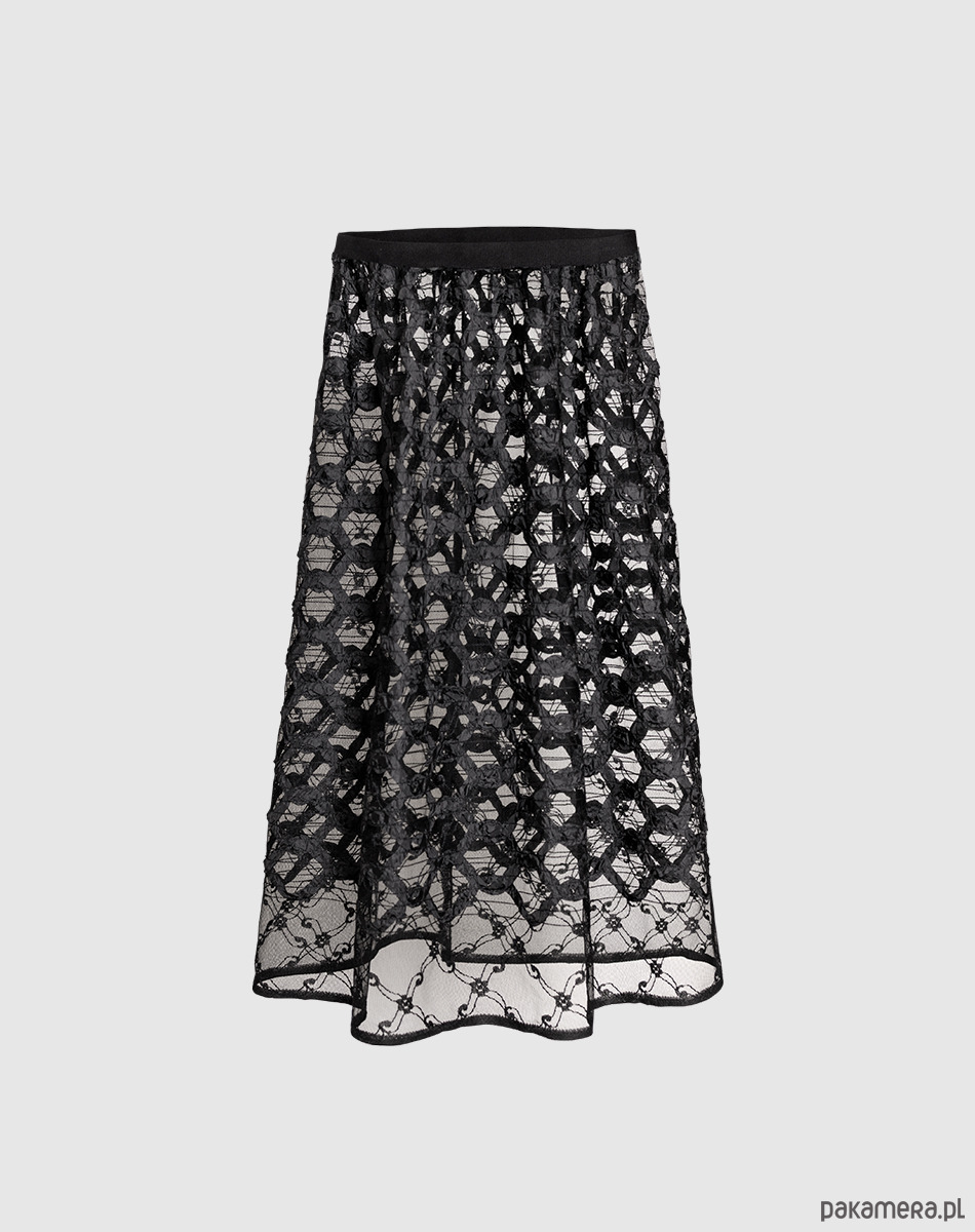 Ażurowa, czarna, lekko rozkloszowana spódnica, uszyta z transparentnego materiału przypominającego koronkę. Pas na gumie, dzięki czemu dopasowuje się do obwodu. Stylowa i efektowna. Świetnie sprawdzi się w stylizacjach z topami, t-shirtami, marynarkami a nawet bluzami dresowymi.