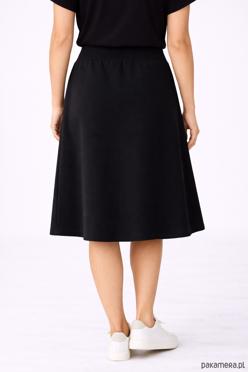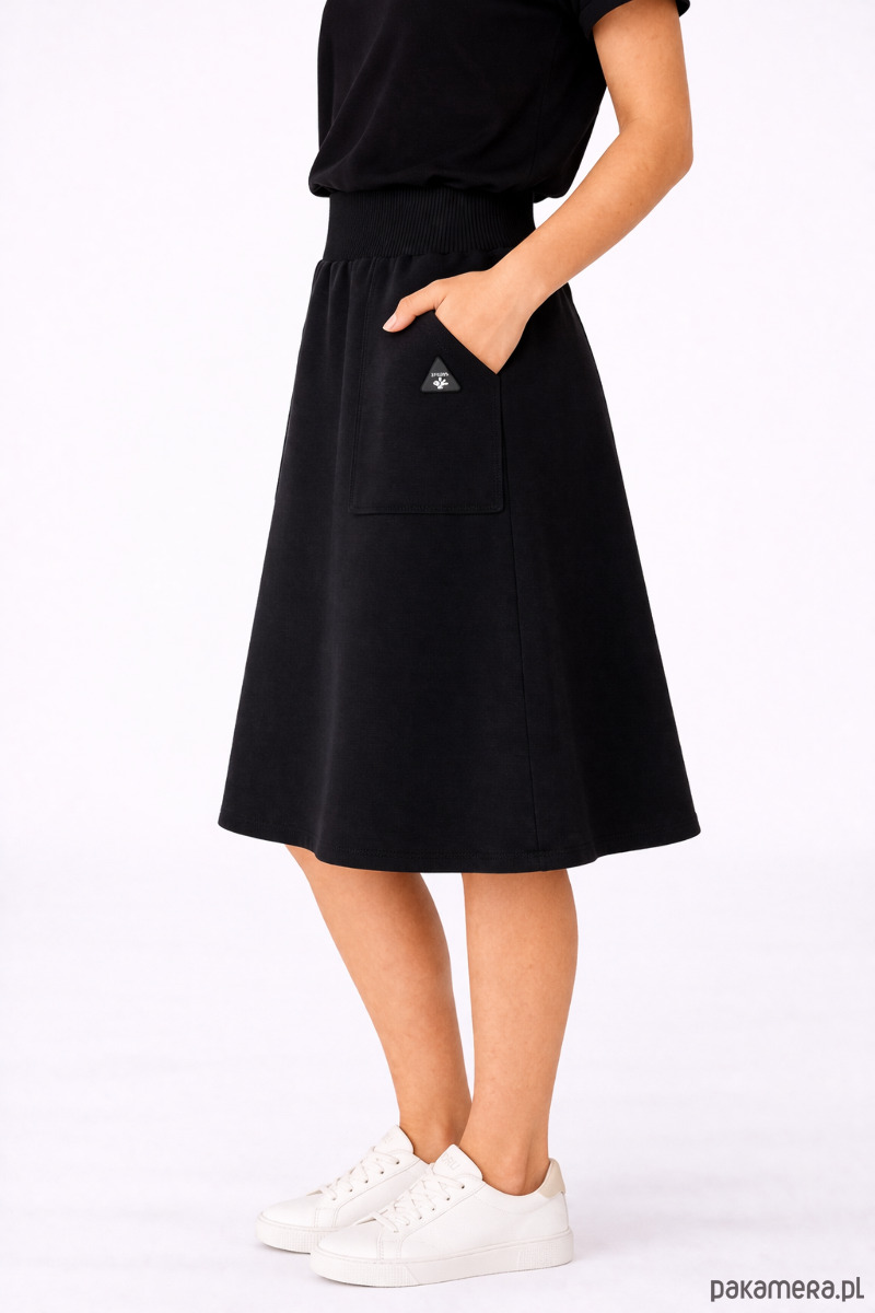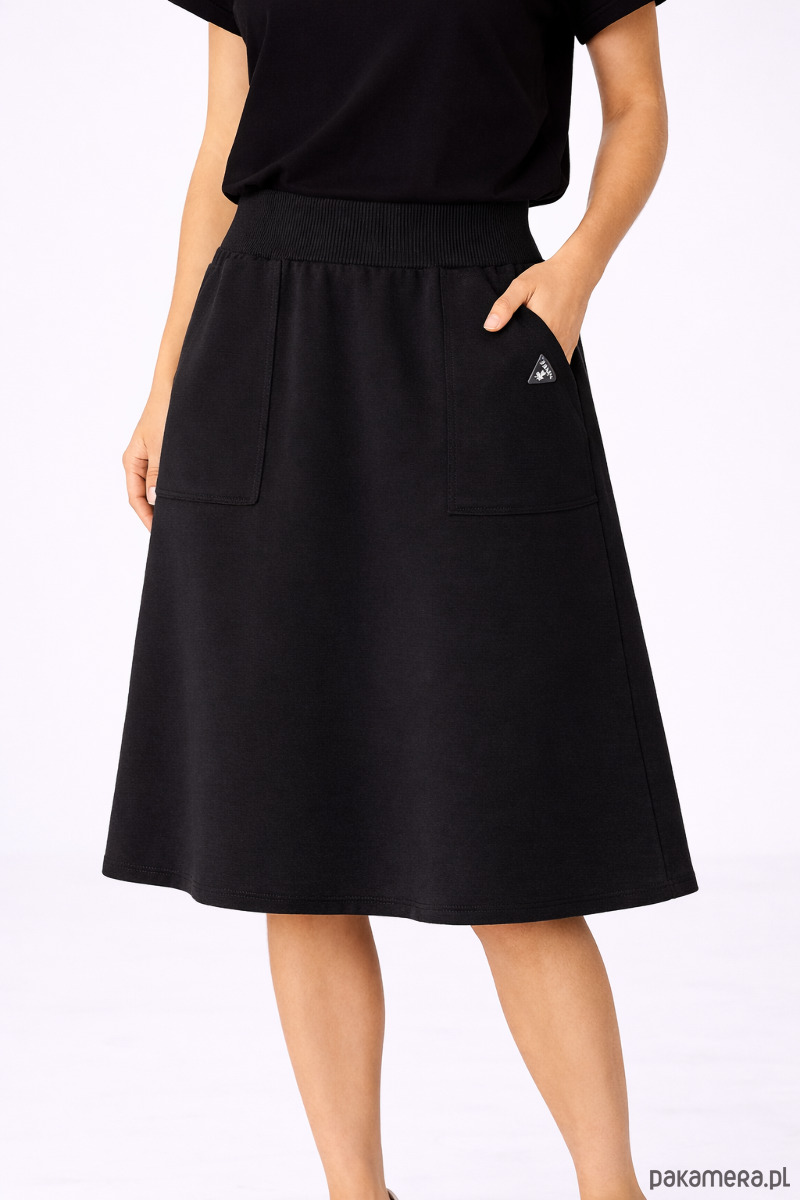 Model o trapezowym kroju pięknie układa się na sylwetce i zapewnia swobodę ruchu. Naszywane kieszenie dodają charakteru i funkcjonalności, a szeroki ściągacz prążek w pasie sprawia, że spódnica idealnie dopasowuje się do ciała — bez ucisku i dyskomfortu.