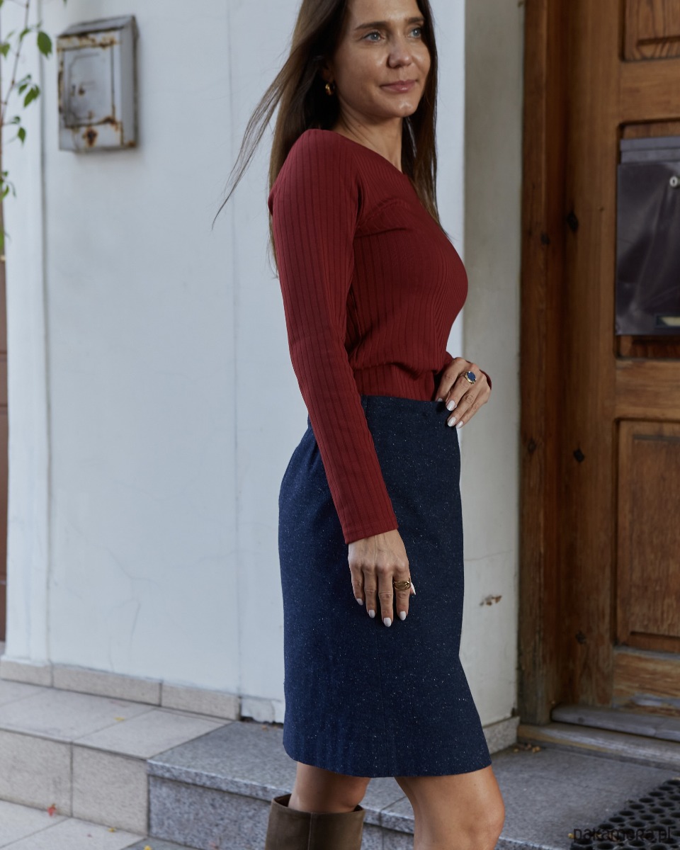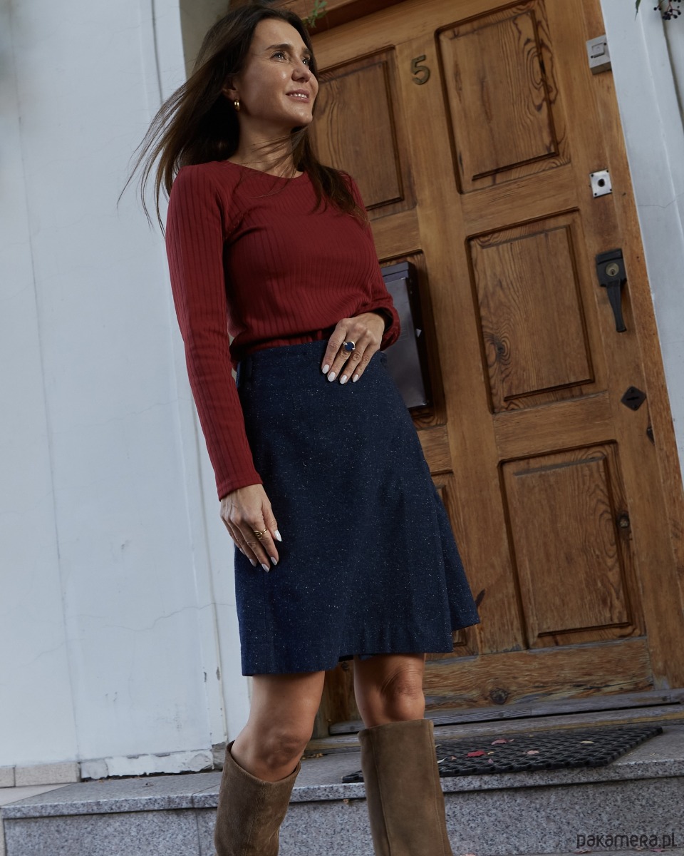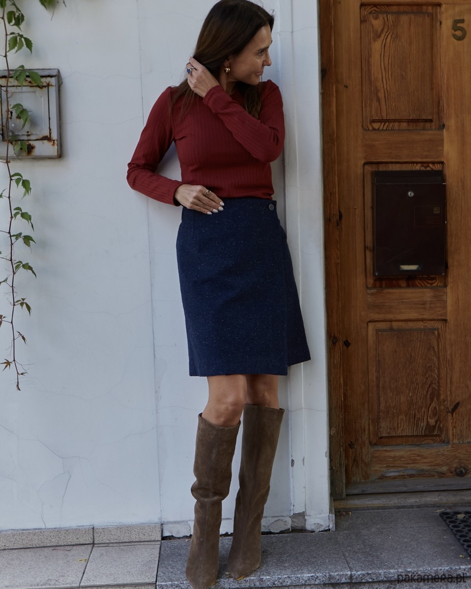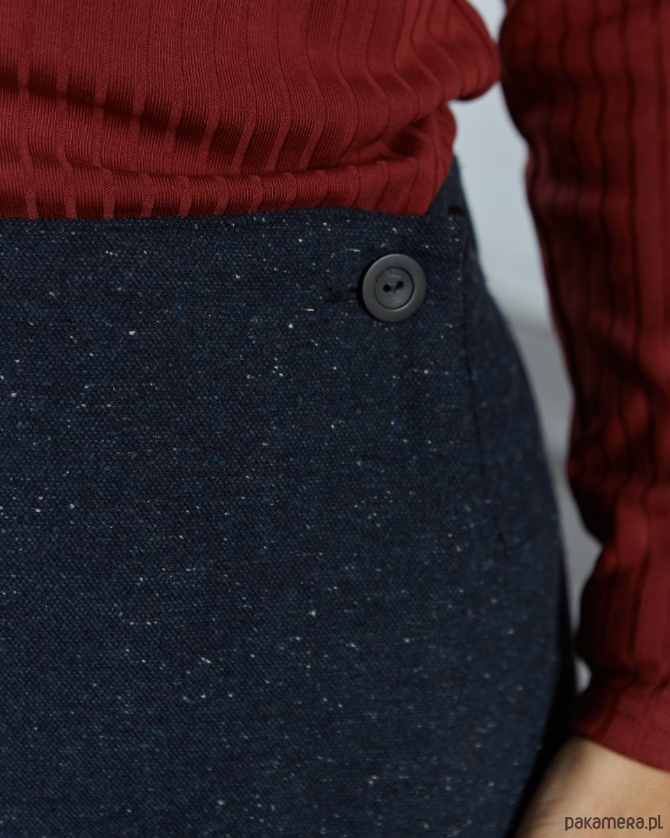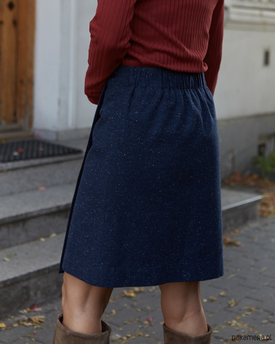 Prosta, kopertowa spódnica uszyta z wysokogatunkowej wełny w kolorze granatowym, na wiskozowej podszewce. Spódnica jest zapinana na guzik od zewnątrz i od spodu. Posiada po dwa guziki od spodu i dwa na zewnątrz, co pozwala na dodatkową regulację. Szerokość można regulować zapinając na wybrany guzik, w zależności od rozmiaru. Idealna na wiele okazji. Pasuje zarówno do sportowych butów jak i do eleganckich szpilek, kozaków. Made in Poland. Garmatura wełny: 170 g/m2.