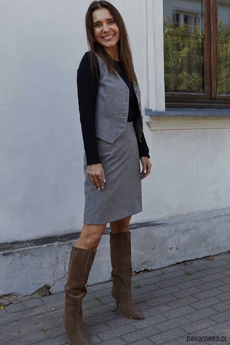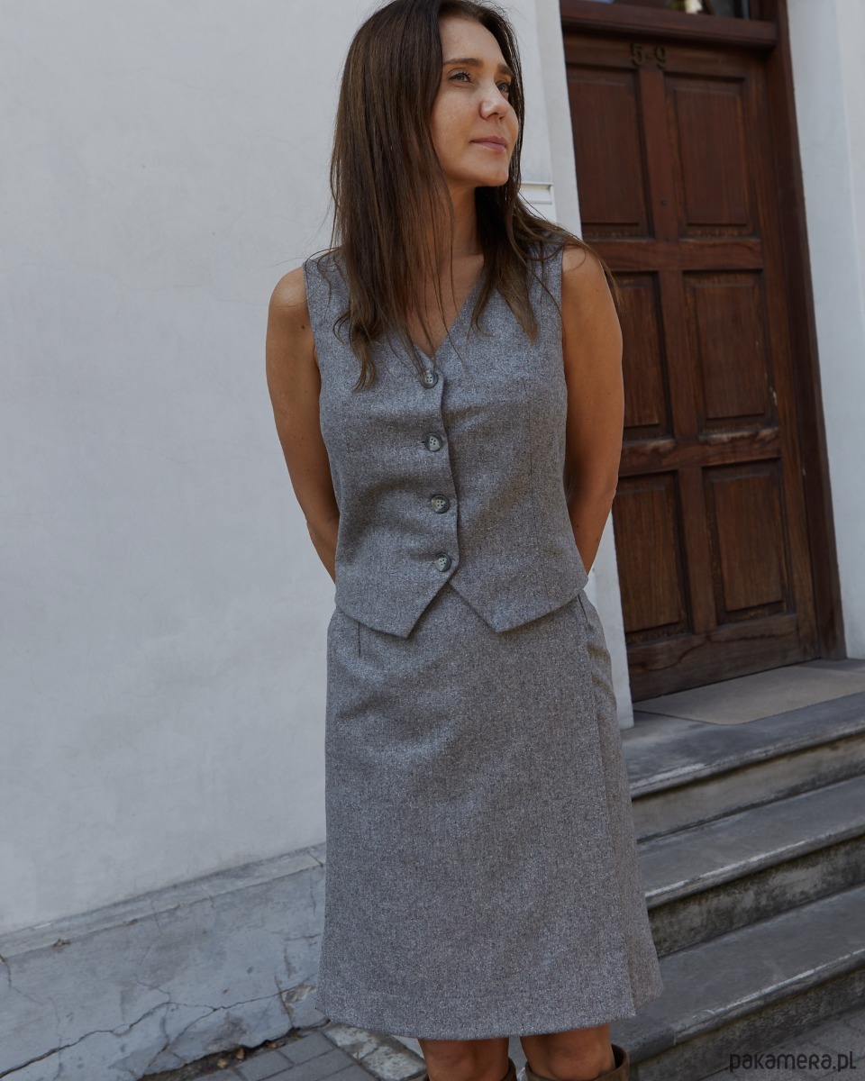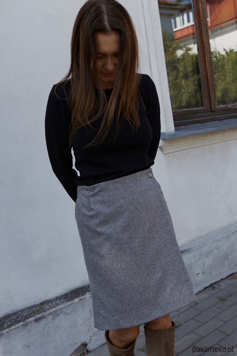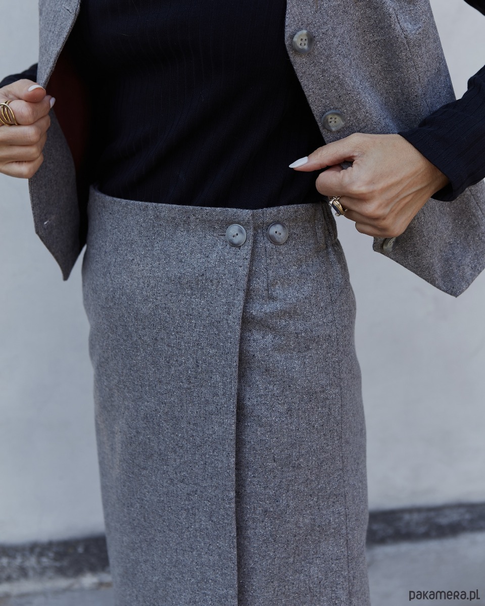 Prosta, kopertowa spódnica uszyta z wysokogatunkowej wełny w kolorze szarym, na wiskozowej podszewce. Spódnica jest zapinana na guzik od zewnątrz i od spodu. Posiada po dwa guziki od spodu i dwa na zewnątrz, co pozwala na dodatkową regulację. Szerokość można regulować zapinając na wybrany guzik, w zależności od rozmiaru. Idealna na wiele okazji. Pasuje zarówno do sportowych butów jak i do eleganckich szpilek, kozaków. Made in Poland. Garmatura wełny: 170 g/m2.