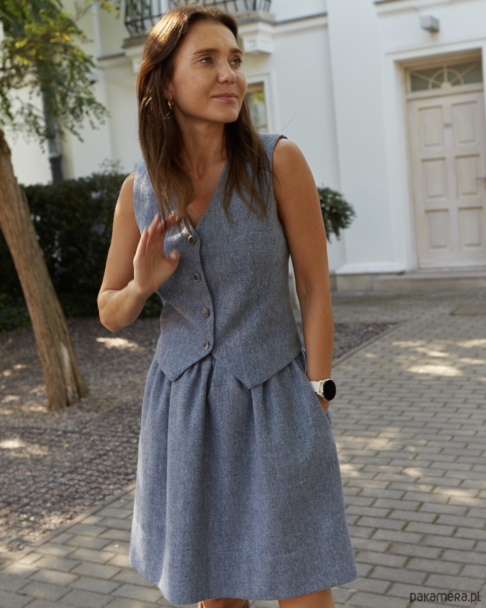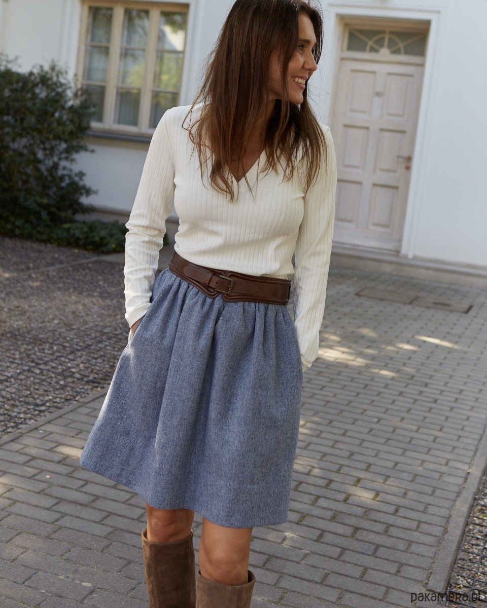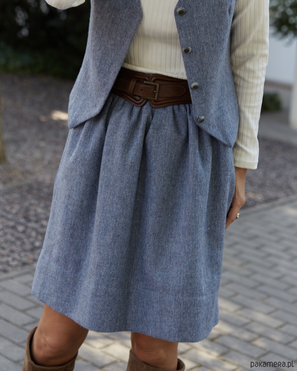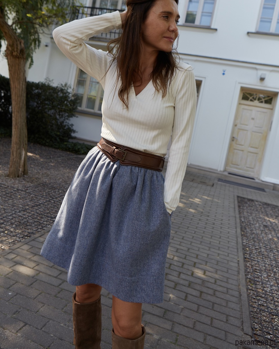 Marszczona, bardzo stylowa spódnica o długości “przed kolano”, posiada podszewkę, wykonana z wysokogatunkowej wełny w kolorze błękitnym. Z tyłu w talii posiada gumę, która pozwala na idealne dopasowanie, z kieszeniami, jest ciepła dlatego idealne sprawdzi się na jesienno-zimową pogodę. Pasuje do wielu stylizacji, zarówno eleganckich jak i sportowych. Posiada szlufki, co umożliwia stylizowanie jej z dowolnym paskiem. Świetnie pasować będzie zarówno do wełnianego swetra jak i eleganckiej koszuli. Wyprodukowana w Polsce, posiada 100% wełny w składzie. Gramatura wełny: 280 g/m2.