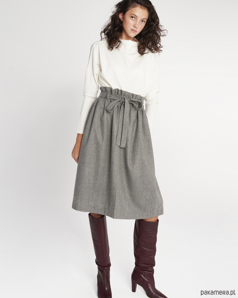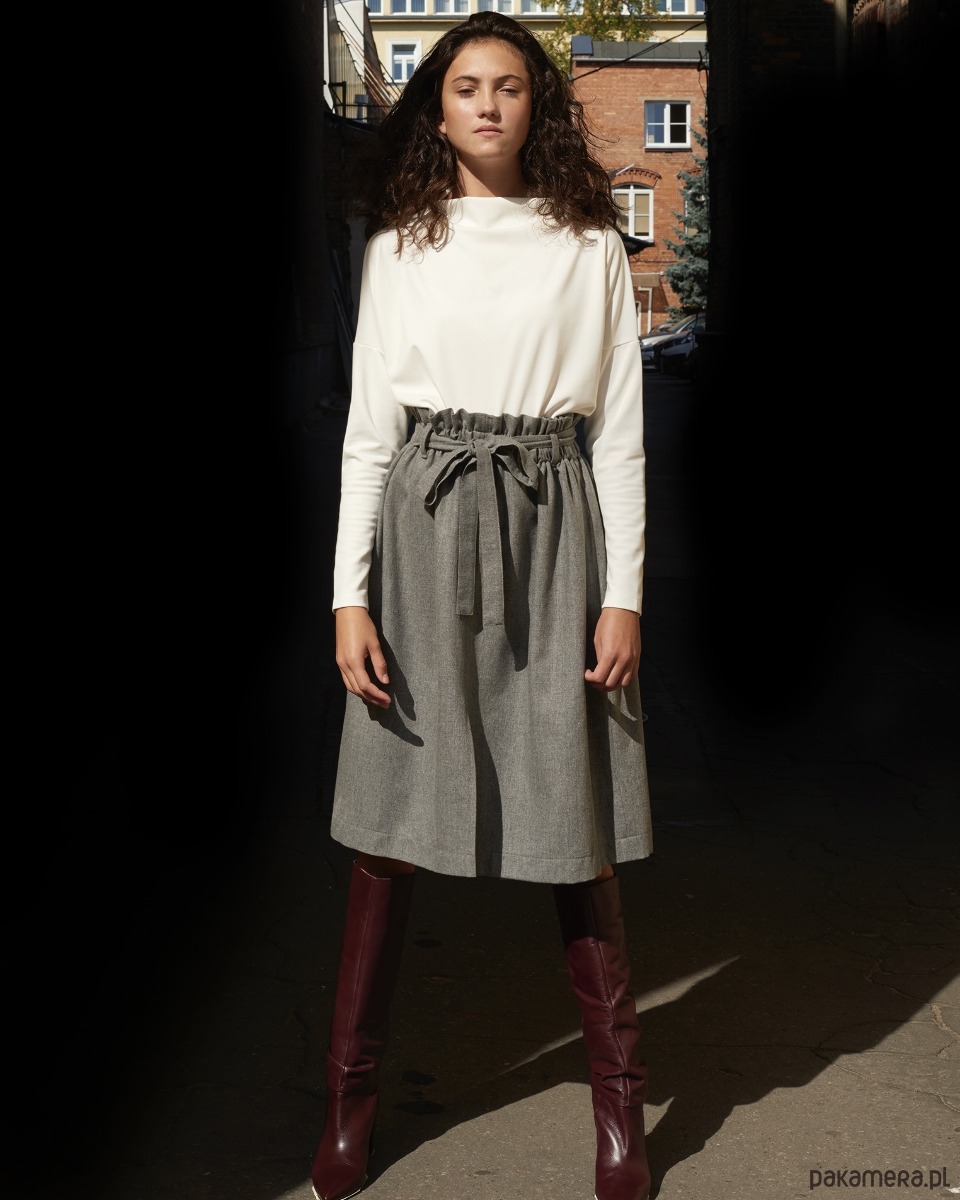 Kobieca i bardzo stylowa spódnica o długości "za kolano", posiada podszewkę, wykonana z wysokogatunkowej wełny w kolorze jasno szarym. W talii posiada gumę, w pasie wiązana na pasek. Posiada kieszenie. Z przodu spódnica ma rozporek. Jest ciepła dlatego idealne sprawdzi się na jesienno-zimową pogodę. Pasuje do wielu stylizacji, zarówno eleganckich jak i sportowych. Świetnie pasować będzie zarówno do wełnianego swetra jak i eleganckiej koszuli. Wyprodukowana w Polsce, posiada 80% wełny w składzie i 20% elany. Garmatura wełny: 170 g/m2.