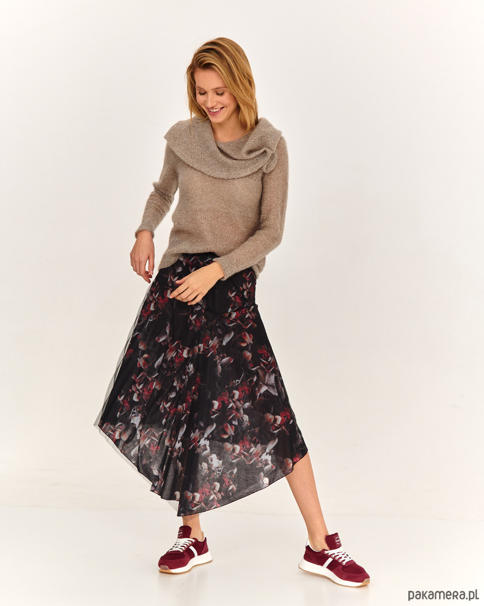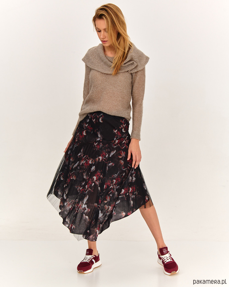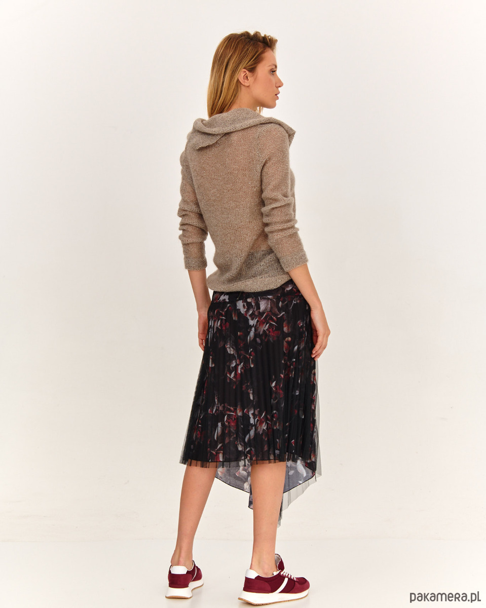 Spódnica z plisowanym dołem oraz z wierzchnią warstwą z tiulu. Druk autorski. Pas z ozdobną gumą oraz zamek na tyle.