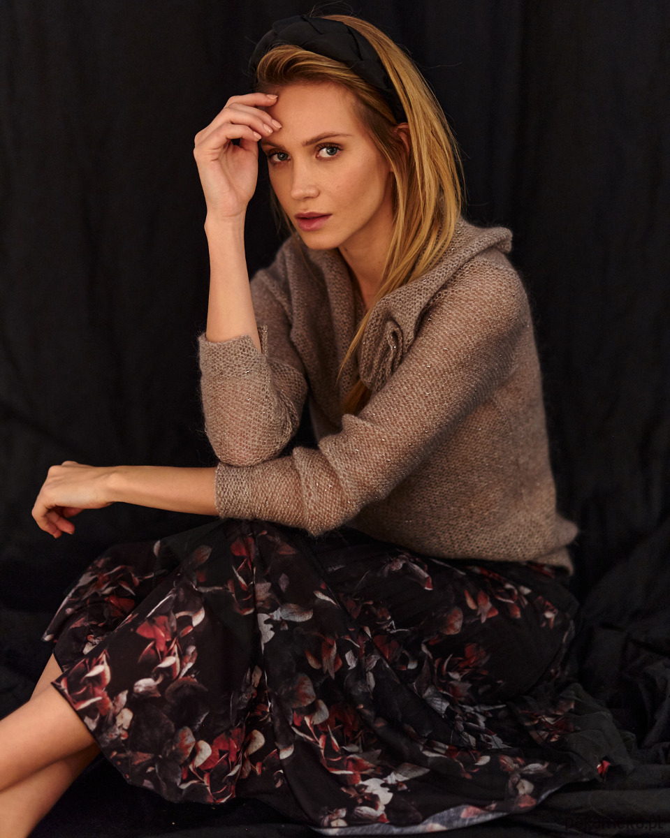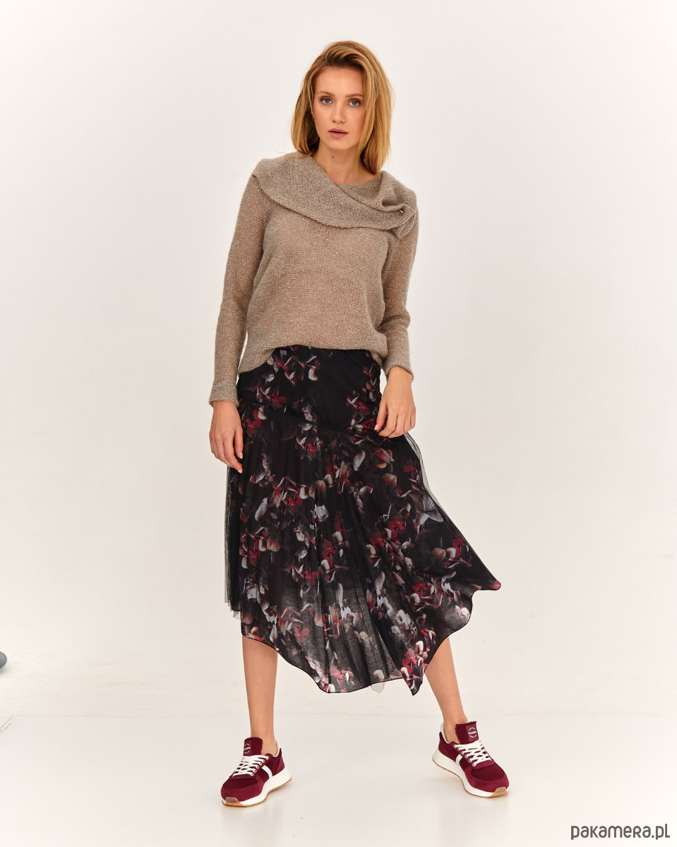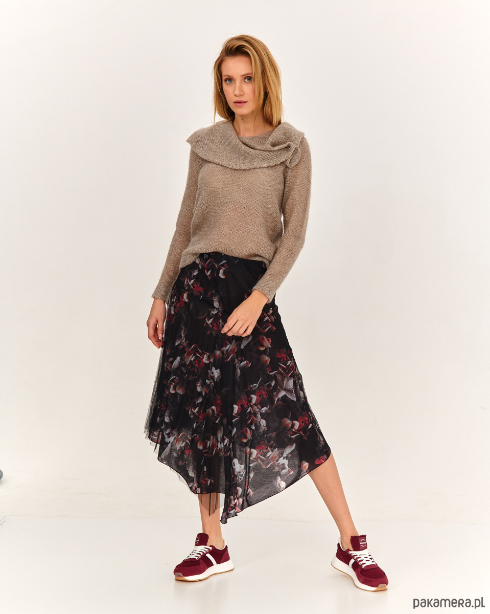 Spódnica z plisowanym dołem oraz z wierzchnią warstwą z tiulu. Druk autorski. Pas z ozdobną gumą oraz zamek na tyle.