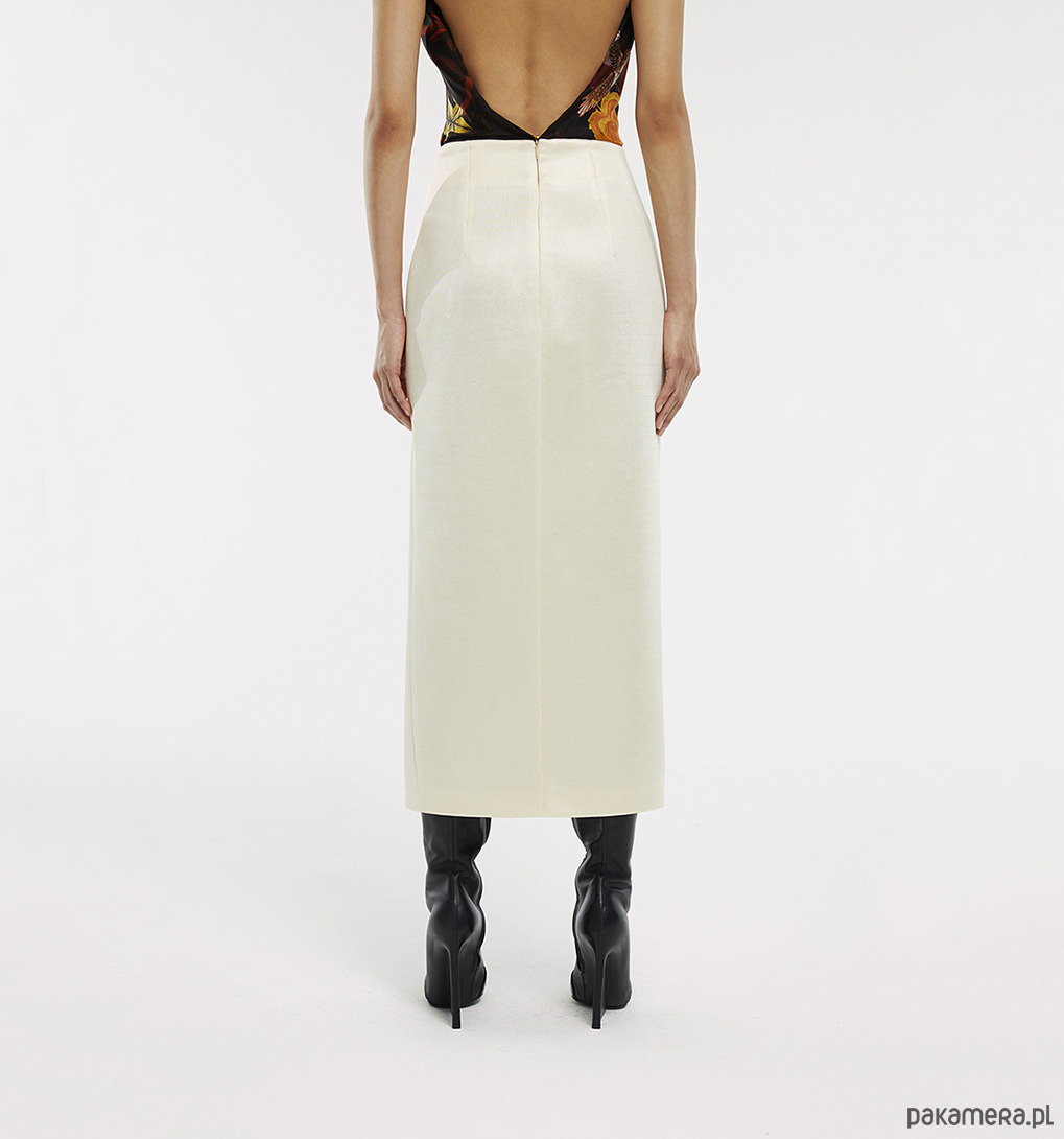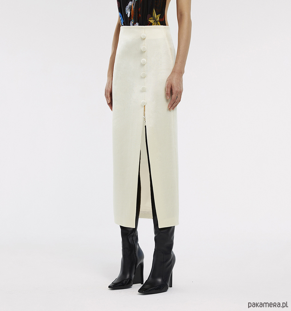 Spódnica z wysoką talią, midi z połyskującej tkaniny. Guziki z tej samej tkaniny z biżuteryjnym akcentem z perłą.