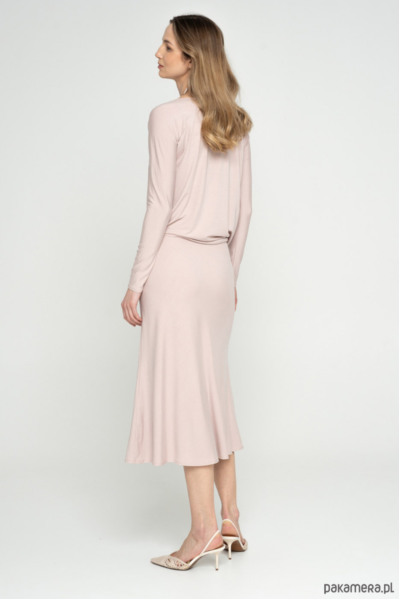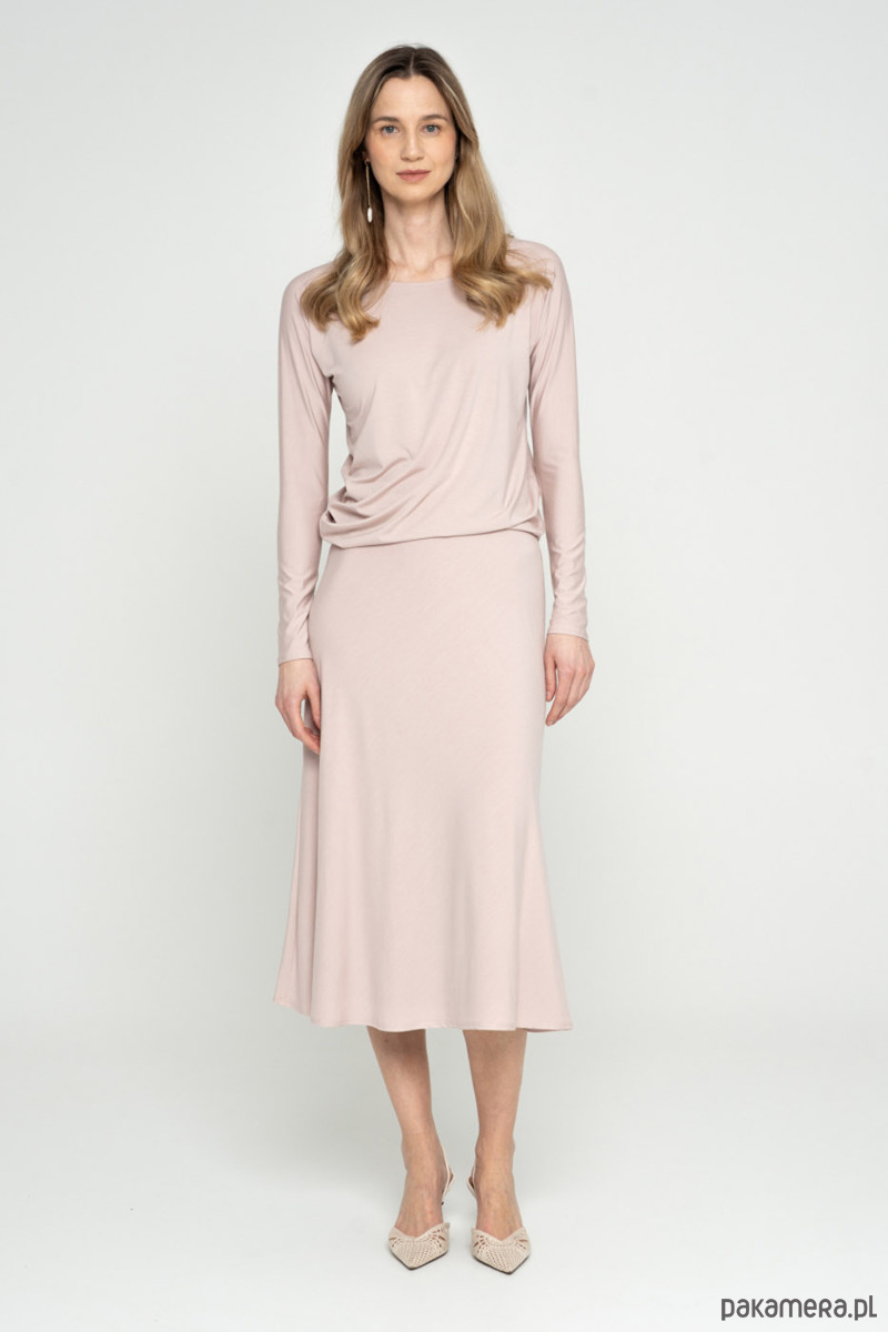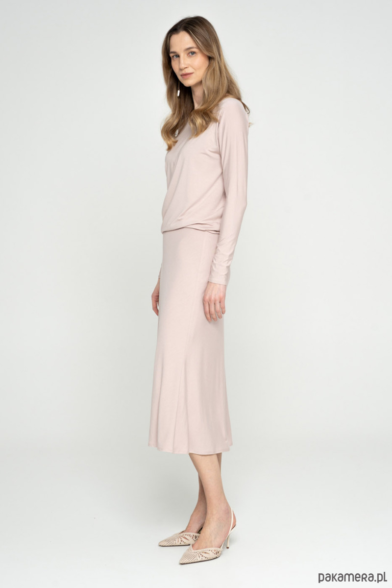 Spódnica szyta po skosie z dzianiny modalowej. Jest dwuwarstwowa przez co dzianina jest bardziej mięsista, kryjąca.