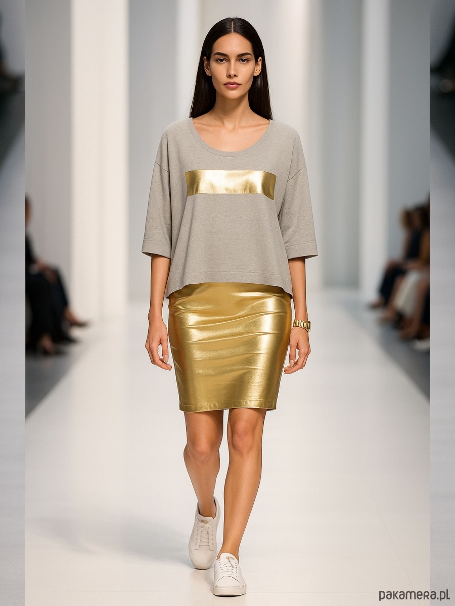 Obowiązkowa pozycja w szafie każdej kobiety; ołówkowa, zwężana ku dołowi; fason na co dzień i od święta; pasuje zarówno do t-shirtu, jak i do koszuli. Wykonana z naturalnej przewiewnej dzianiny. Kolor spódnicy: złoty.. Długość całkowita ok. 55 cm. Tkanina: 70% wiskoza, 27% poliamid, 3% elastan. Pranie w pralce w temp. 30 stopni; suszenie w stanie rozwieszonym, prasowanie parą.