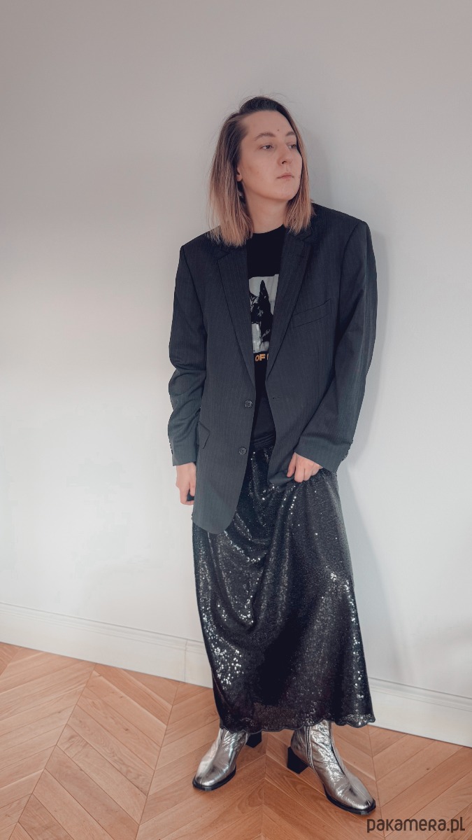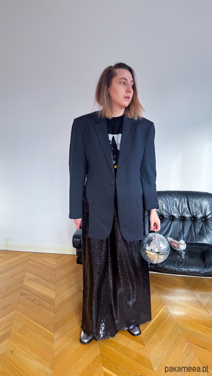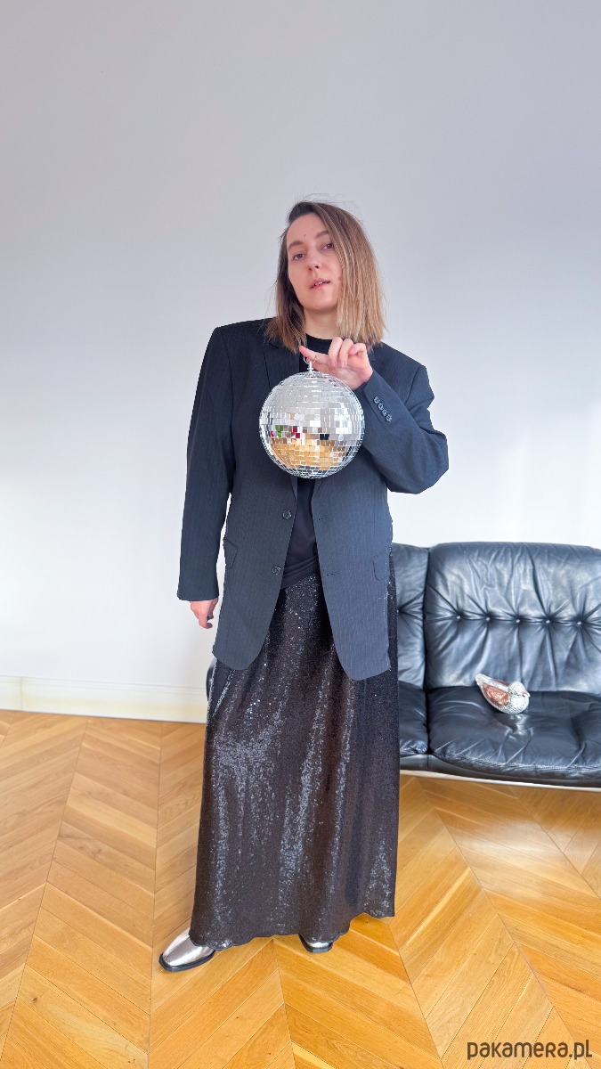Midnight Shine Skirt to czarna cekinowa spódnica, która przyciąga uwagę. Uszyłam ją z materiału z drugiego obiegu, którego delikatny połysk ujawnia się w świetle i ruchu.