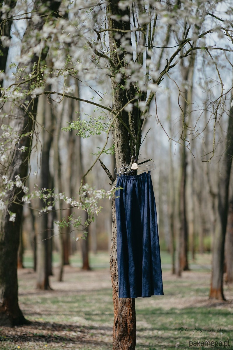Długa lniana spódnica w kolorze głębokiego granatu. W pasie gumka z przeszyciem, dzięki czemu spódnica idealnie dopasuje się do talii.