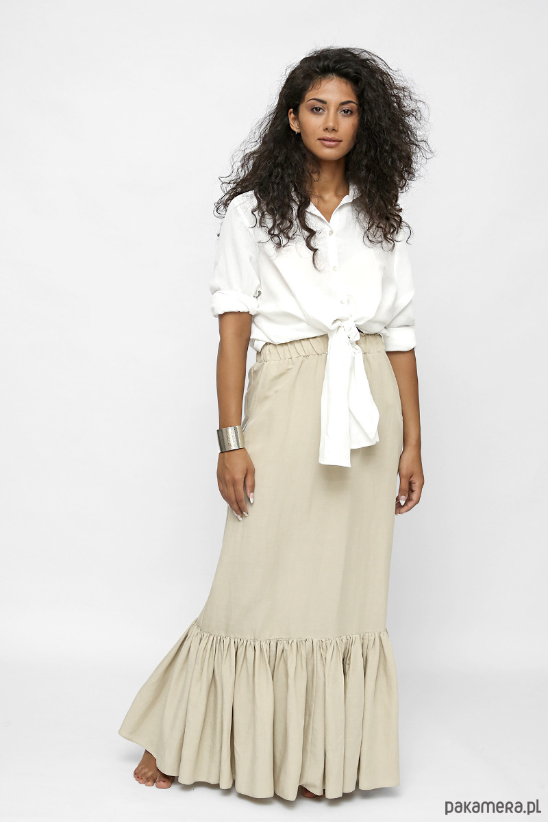 Lekko luźna, z szeroką, nie uciskającą gumką w pasie i marszczoną falbanką u dołu, z przodu dwie, wpuszczane kieszenie. Swobodna i lekka, kobieca i wygodna spódniczka