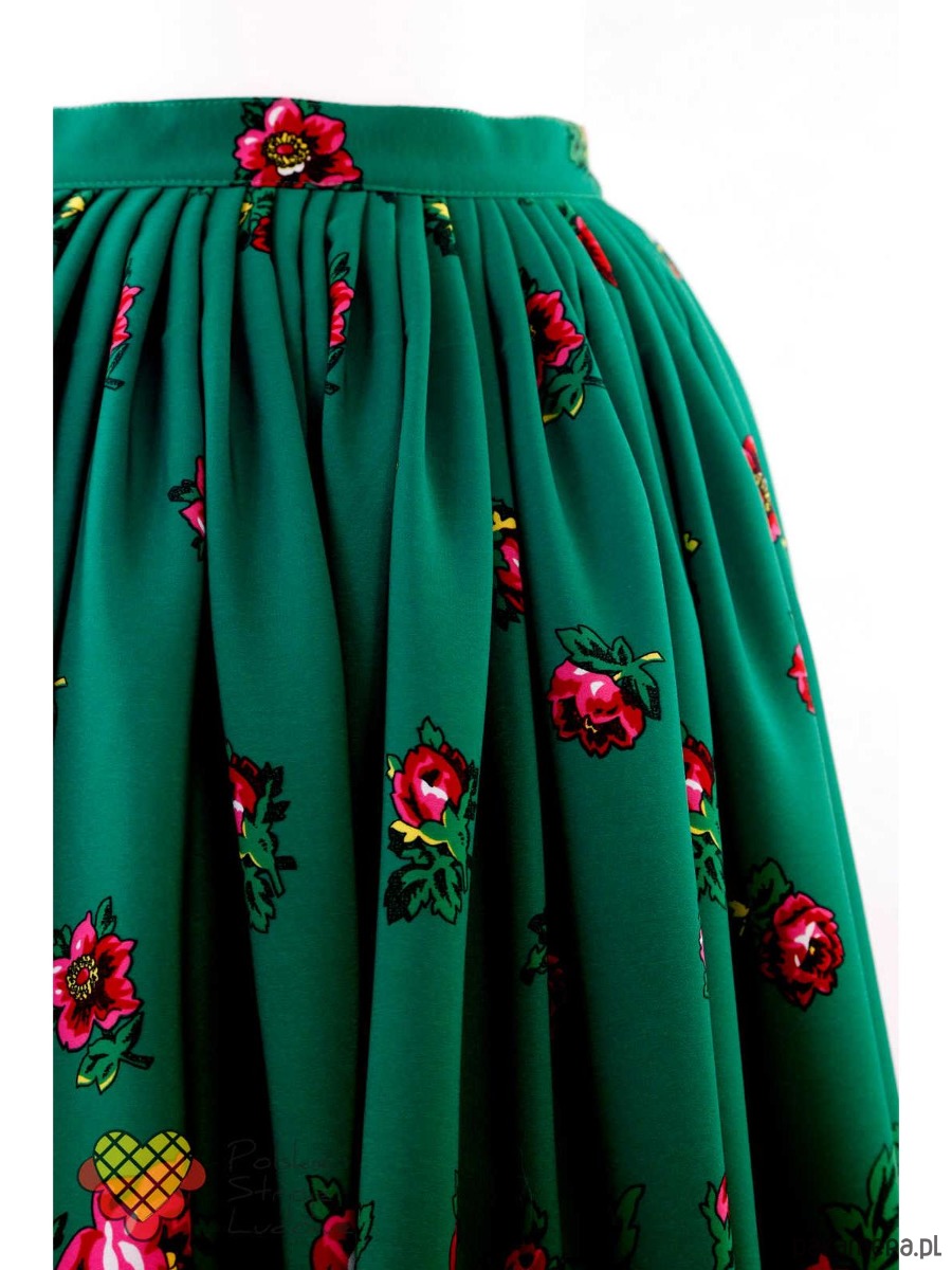 Suto marszczona spódnica ludowa została uszyta z tkaniny poliestrowej w urocze różyczki.