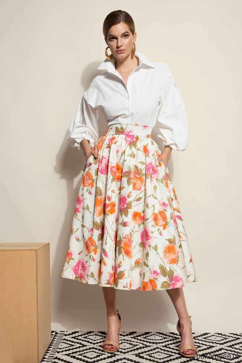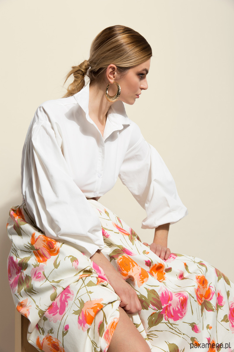 Elegancka rozkloszowana spódnica w długości midi, uszyta z satynowanej bawełny w kolorze ecru. Niepotarzalny print w kwiaty.