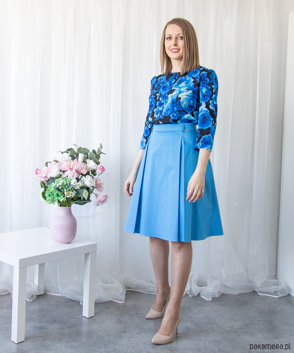 Kontrafałdy umieszczone są z przodu i z tyłu spódnicy. W szwach bocznych kieszenie, szlufki przy pasku. Spódnica posiada klasyczną, wiskozową podszewkę. Uszyta z delikatnej, cienkiej bawełny o żywym odcieniu niebieskiego.