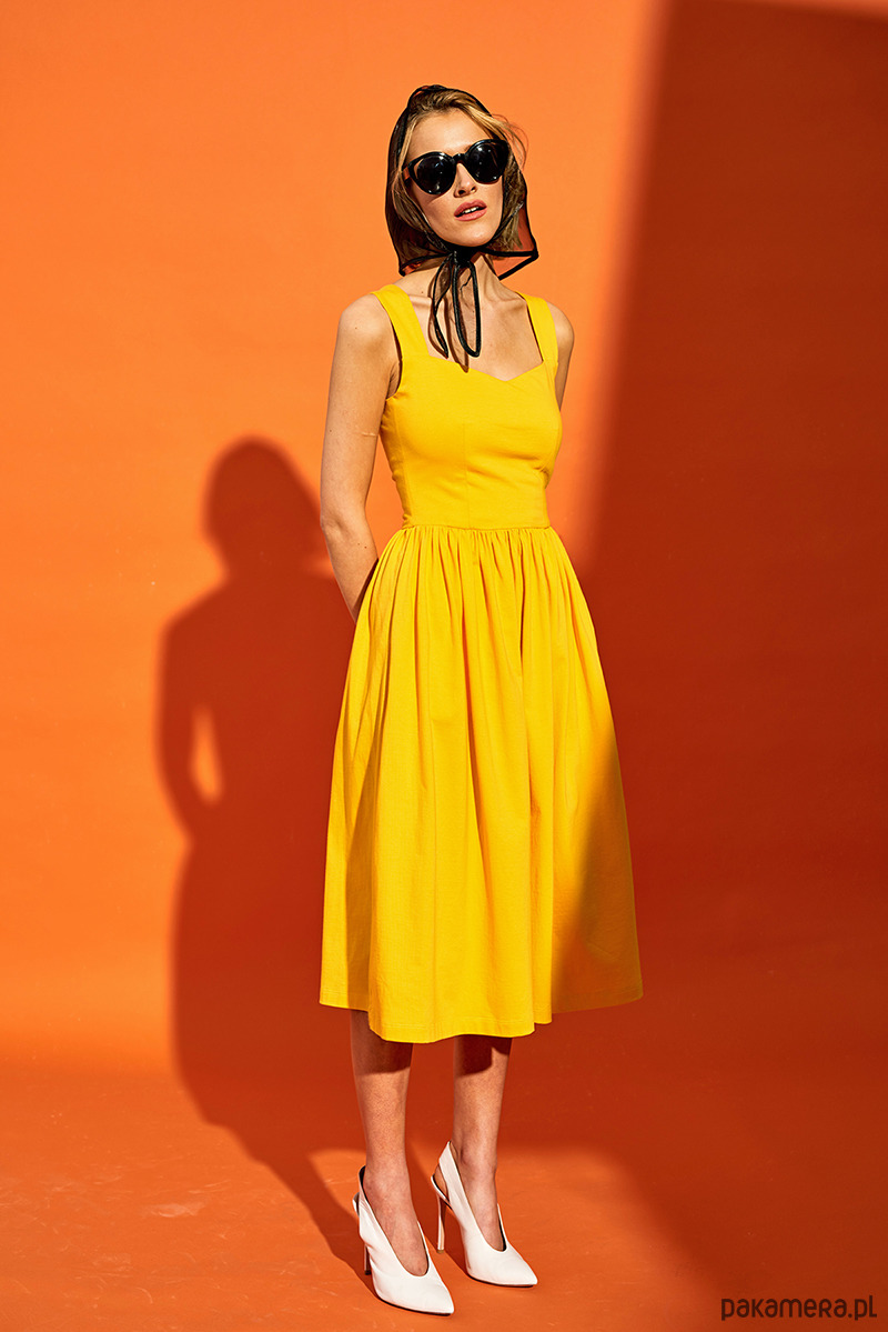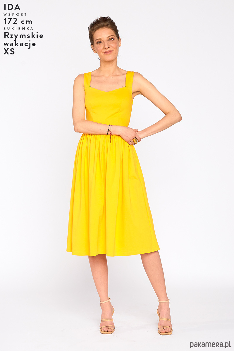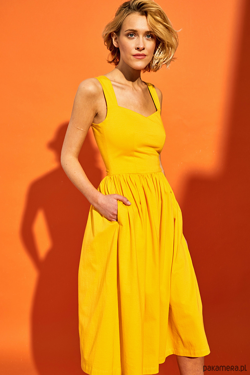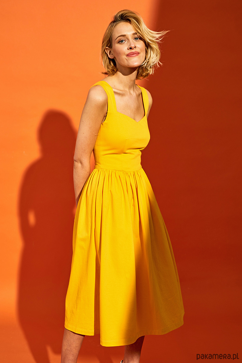 EDYCJA LIMITOWANA Kwintesencja kobiecości - rozległy dekolt na szerokich ramiączkach jak u Sophii Loren, podkreślona talia jak u Monici Bellucci, a do tego klasyk - rozkloszowany dół poniżej kolana. Niezależnie od tego, czy występuje w zestawie z wysokimi obcasami, koturnami, czy trampkami - robi niesamowite wrażenie. Nie tylko na mężczyznach, ale na przechodniach obu płci.