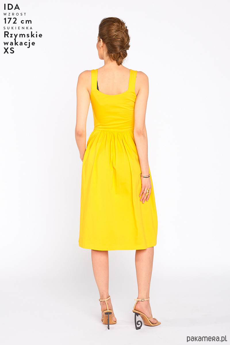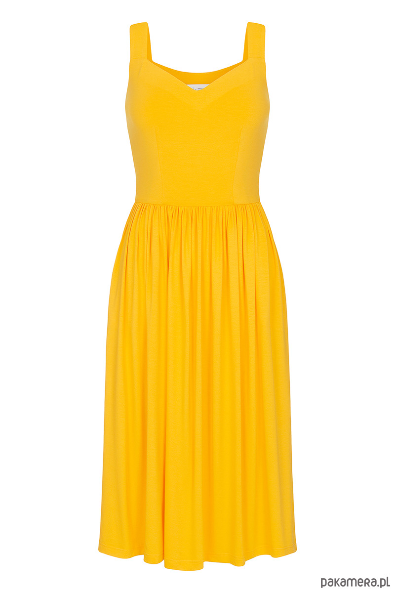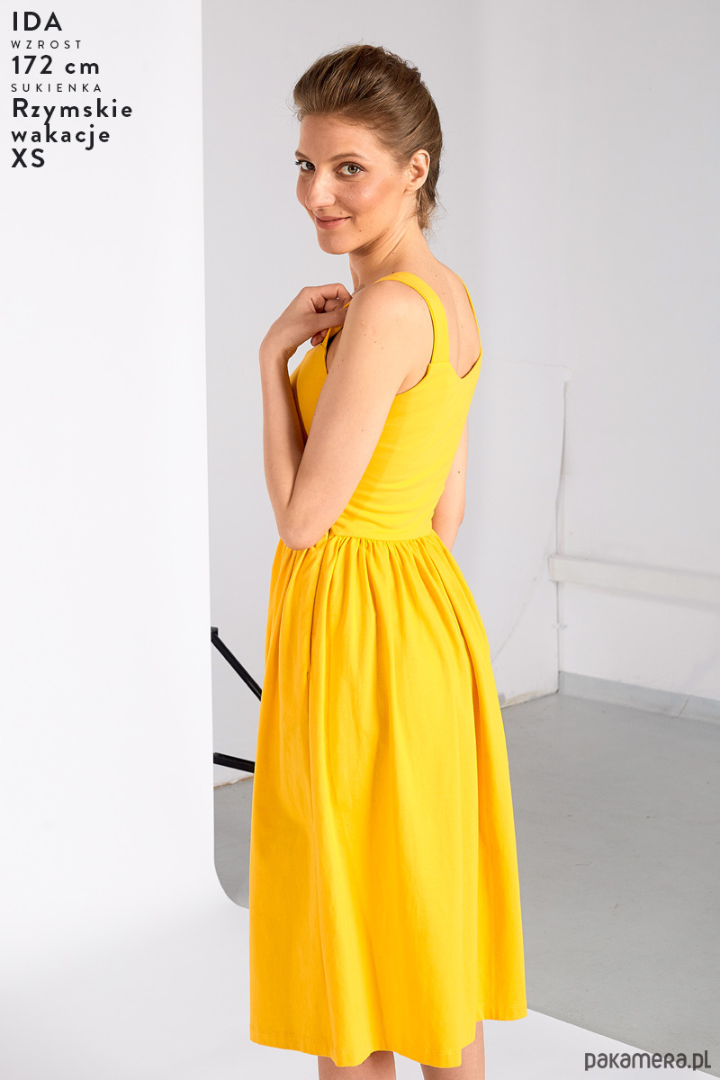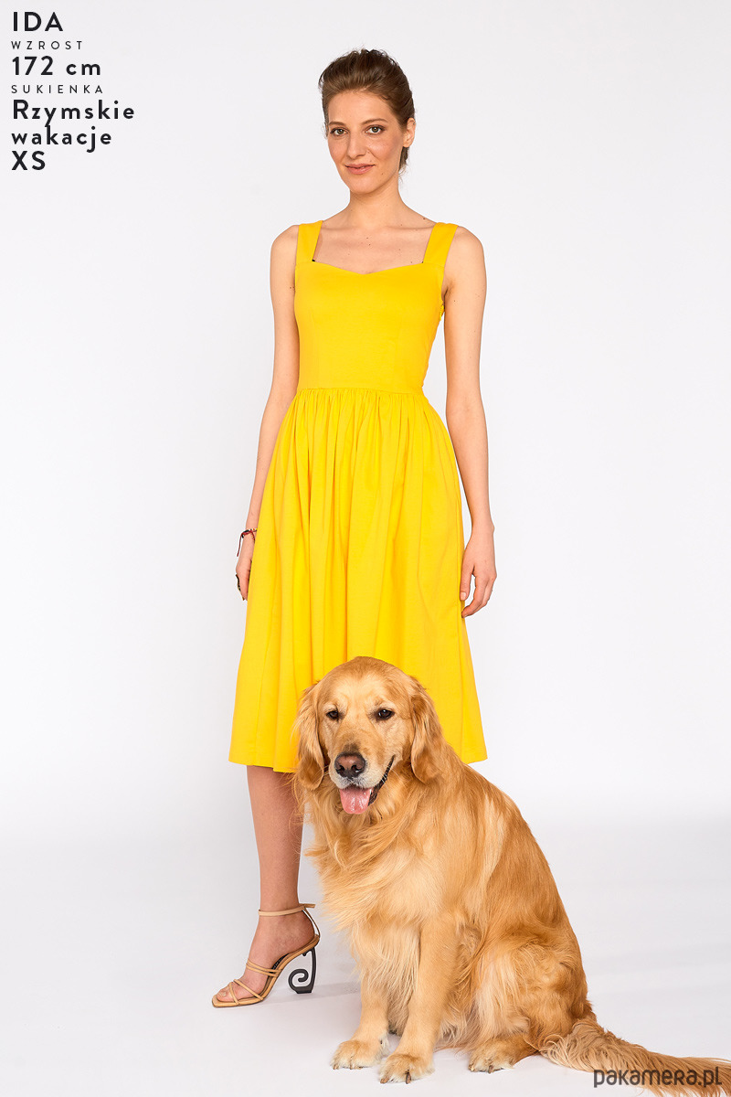EDYCJA LIMITOWANA Kwintesencja kobiecości - rozległy dekolt na szerokich ramiączkach jak u Sophii Loren, podkreślona talia jak u Monici Bellucci, a do tego klasyk - rozkloszowany dół poniżej kolana. Niezależnie od tego, czy występuje w zestawie z wysokimi obcasami, koturnami, czy trampkami - robi niesamowite wrażenie. Nie tylko na mężczyznach, ale na przechodniach obu płci.