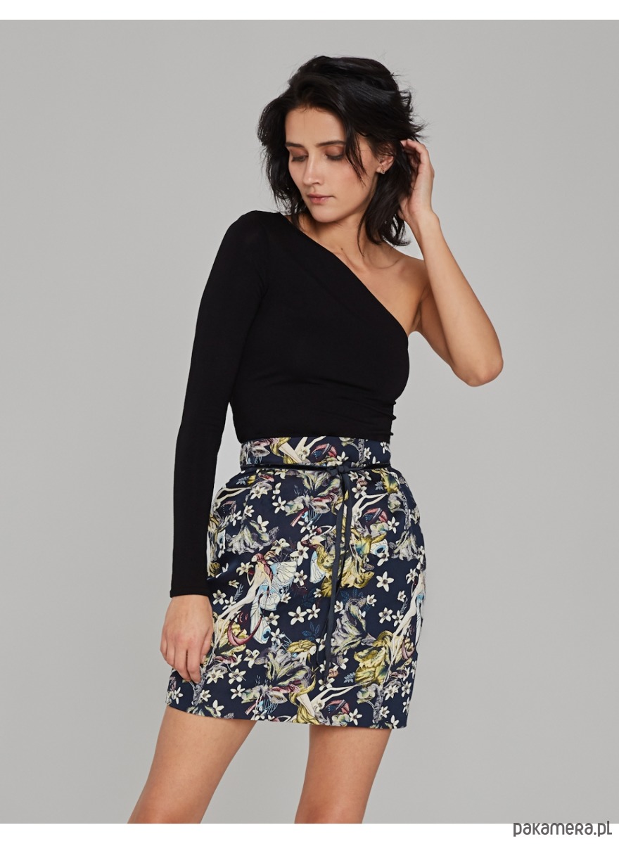 Krótka spódnica uszyta z tkaniny o oryginalnym wzorze baśniowej krainy z elfami;