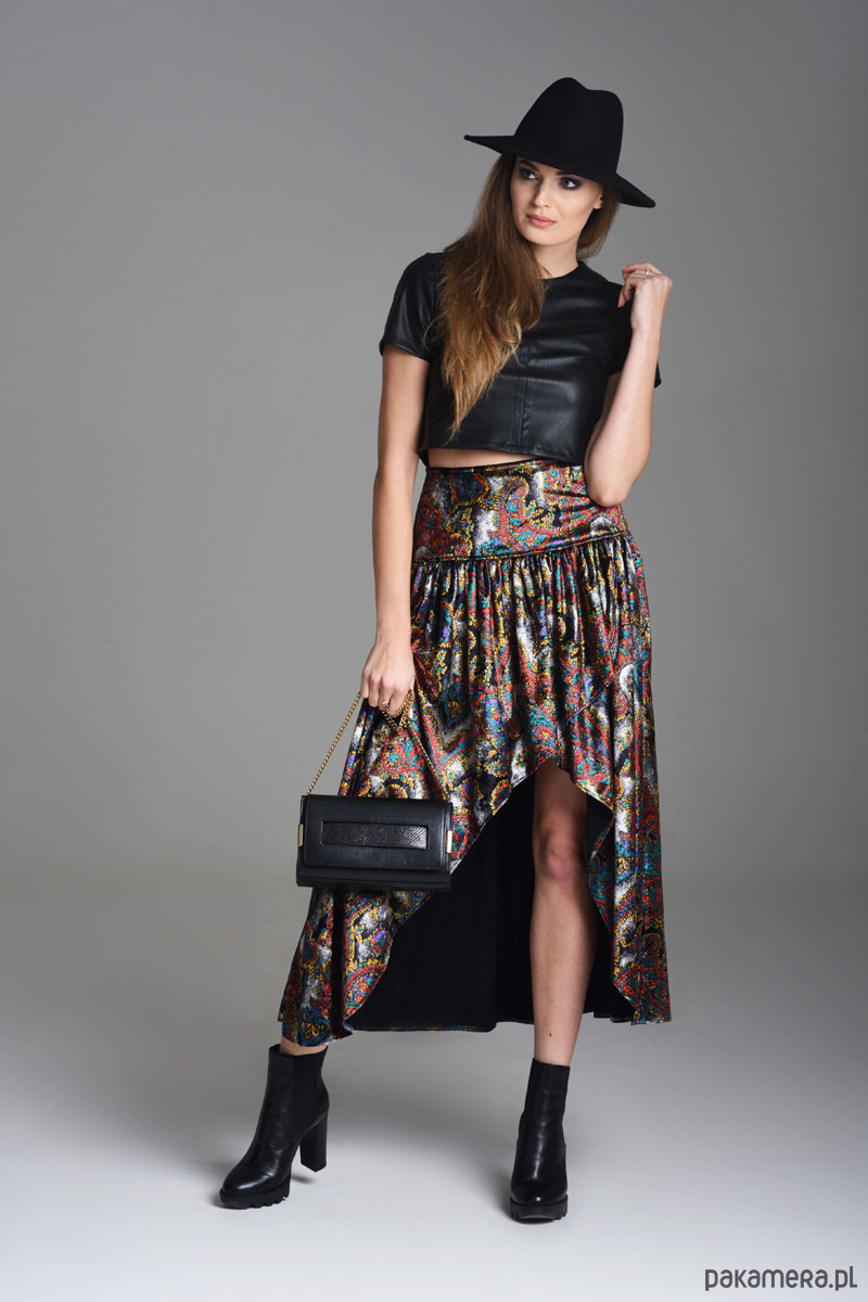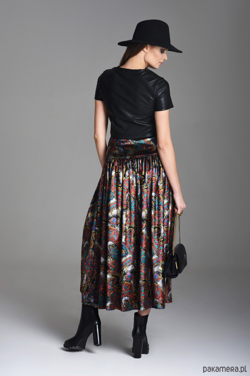 Spódnica uszyta z mięciutkiego aksamitu lekko elastycznego w orientalny wzór. Mocno marszczona na szerokim karczku. Asymetryczny krój. Zapinana na kryty zamek.