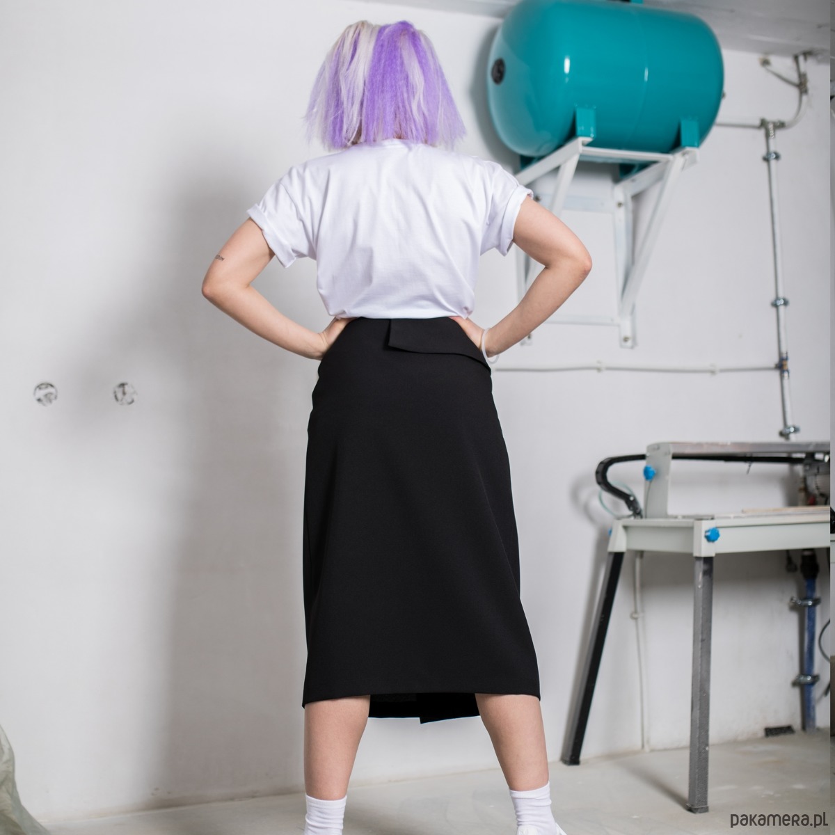 Spódnica kopertowa - na zakładkę, geometryczny krój, wykonana z wysokogatunkowej tkaniny z dodatkiem satyny i lycry w kolorze czarnym. Minimalistyczne wiązanie z przodu. Swobodna regulacja rozmiaru w pasie i biodrach z racji na swój krój. Z tyłu delikatna asymetryczna zakładka.