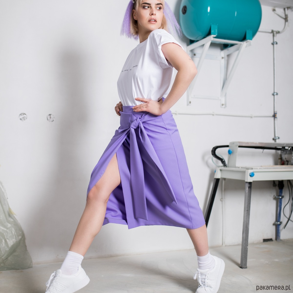 Spódnica kopertowa - na zakładkę, geometryczny krój, wykonana z wysokogatunkowej tkaniny z dodatkiem satyny i lycry w kolorze fioletowym. Minimalistyczne wiązanie z przodu. Swobodna regulacja rozmiaru w pasie i biodrach z racji na swój krój. Z tyłu delikatna asymetryczna zakładka.
