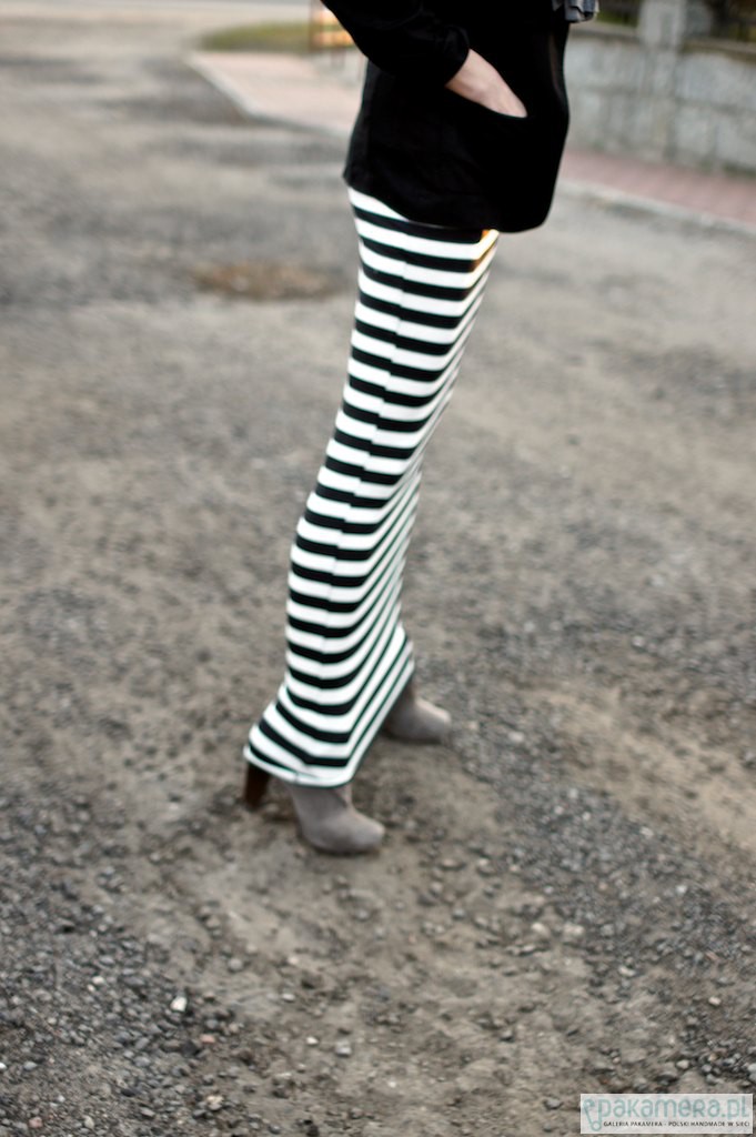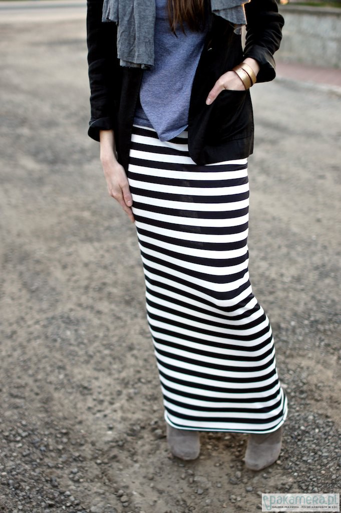 Spódnica maxi, wąska , maxi.Uszta z jerseyu(viscosza)w ciemno granatowo białe paski o szerokości ok 1,8 cm Pasek elastyczy, szeroka gumka kryta. Dół surowy. Długość calkowita ok 108 cm. Obwód paska ok 76cm. Szerokośc na dole ok 90 cm Rozmair S Dostępna też w kolorze szary i czarny.