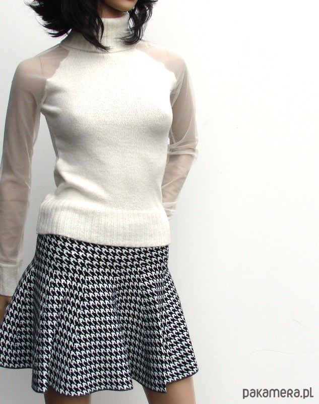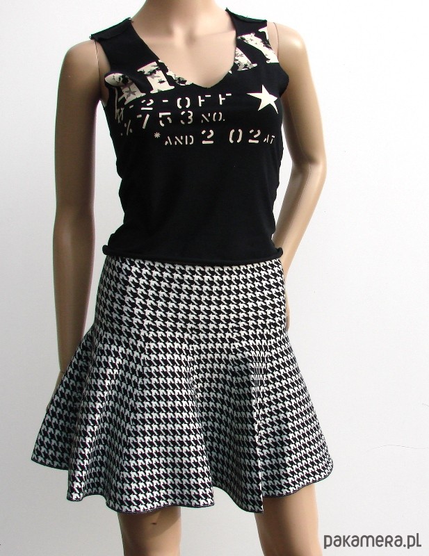 mała spódniczka z z lekko elastycznej dzianiny, pięknie dopasowuje się do sylwetki, spora tolerancja rozmiarowa, modny deseń kurzej stopki skład; bawełna 65%, poliester 30%, elastan 5% dłg; 40 cm obw. w obniżonym pasie; 68-76 cm