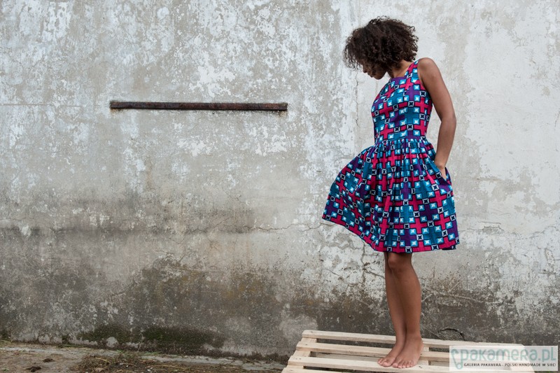 Rozkloszowana sukienka wykonana z afrykańskiego materiału potocznie nazywanego w Afryce batikiem. Materiał został sprowadzony z Gambii. rozmiar S: talia: 73 cm biust: 84 cm długość całkowita: 92 cm