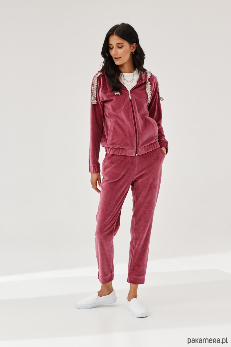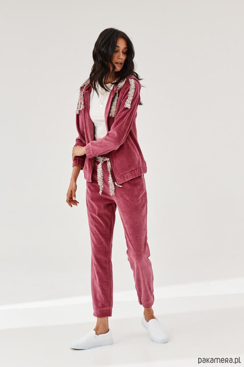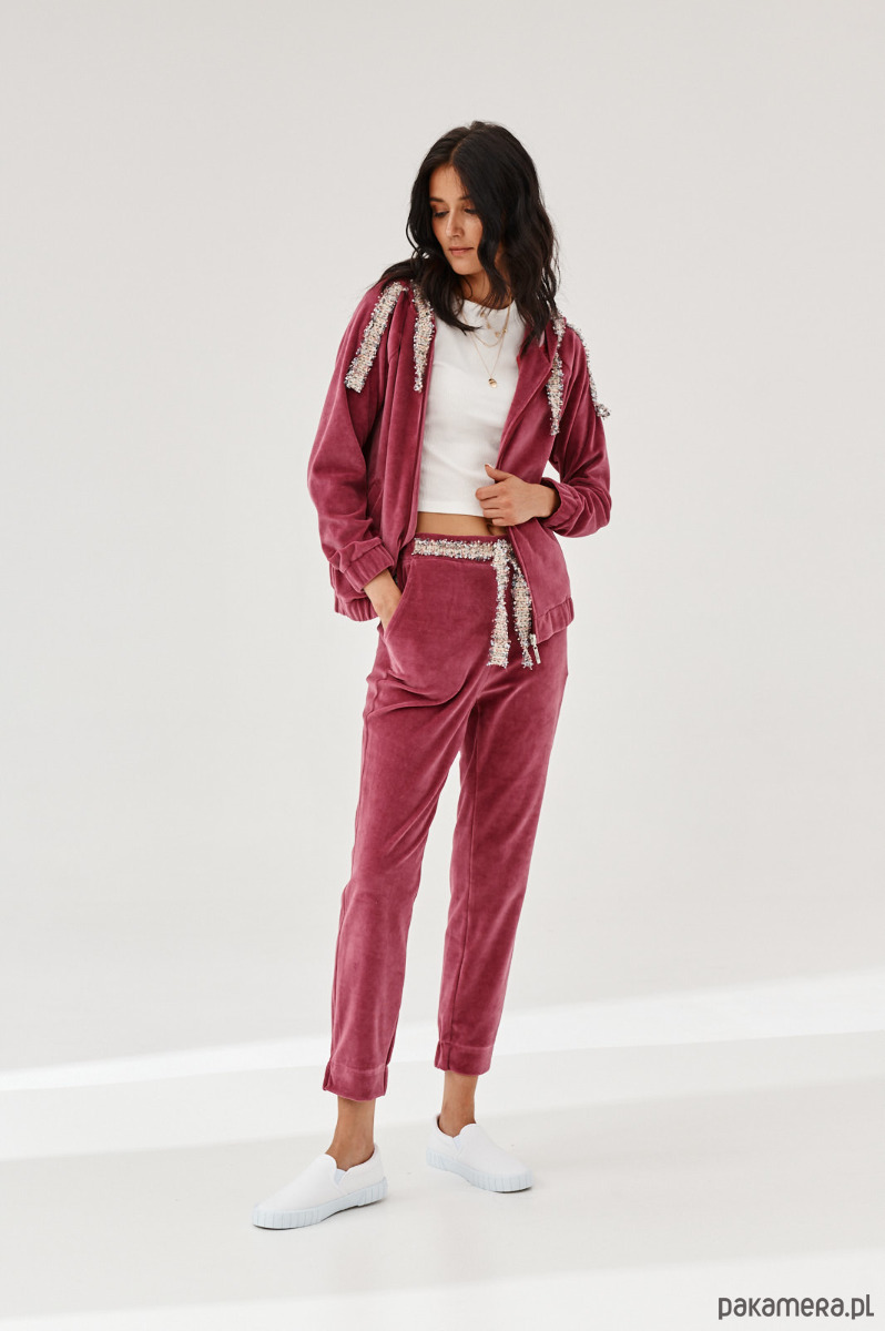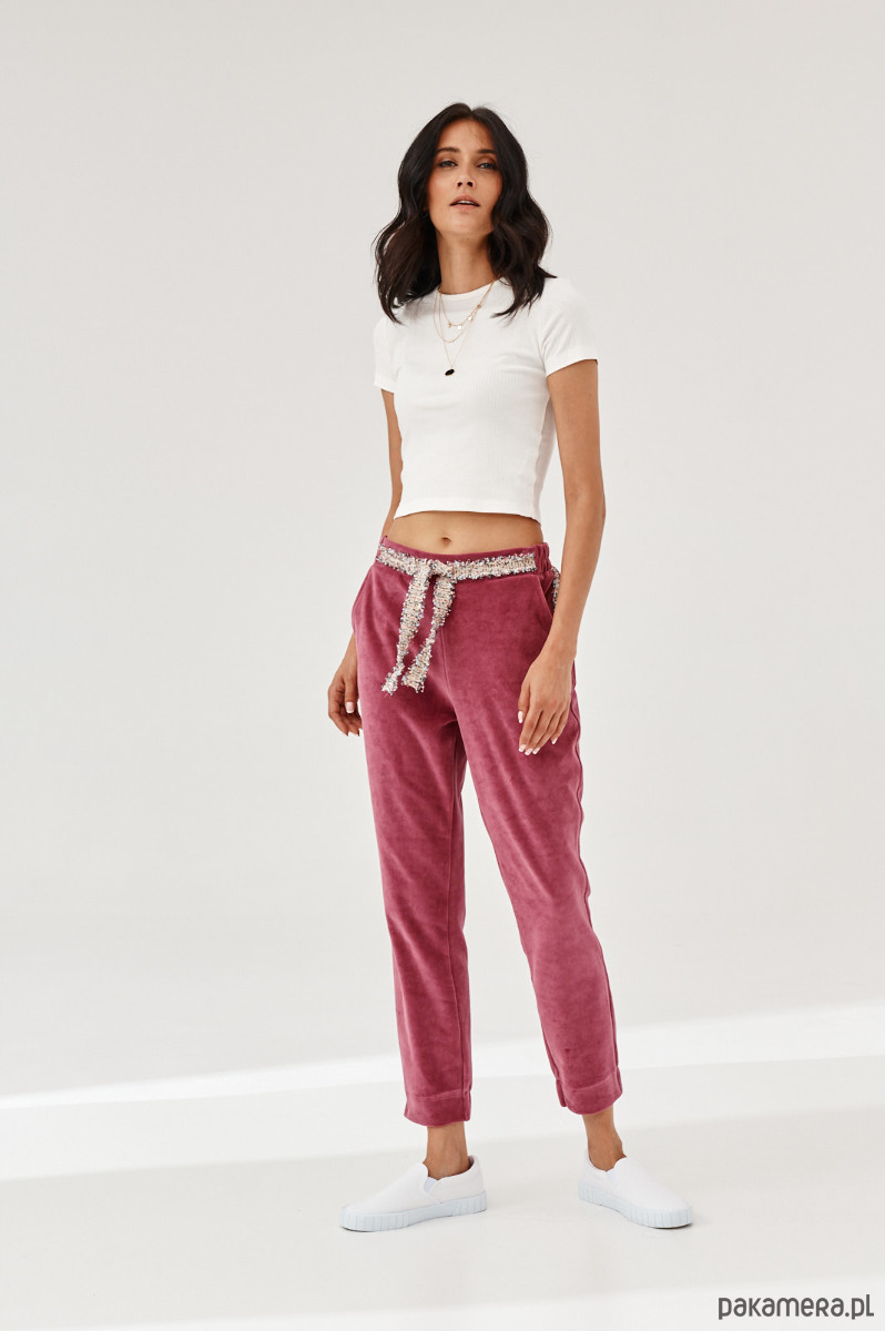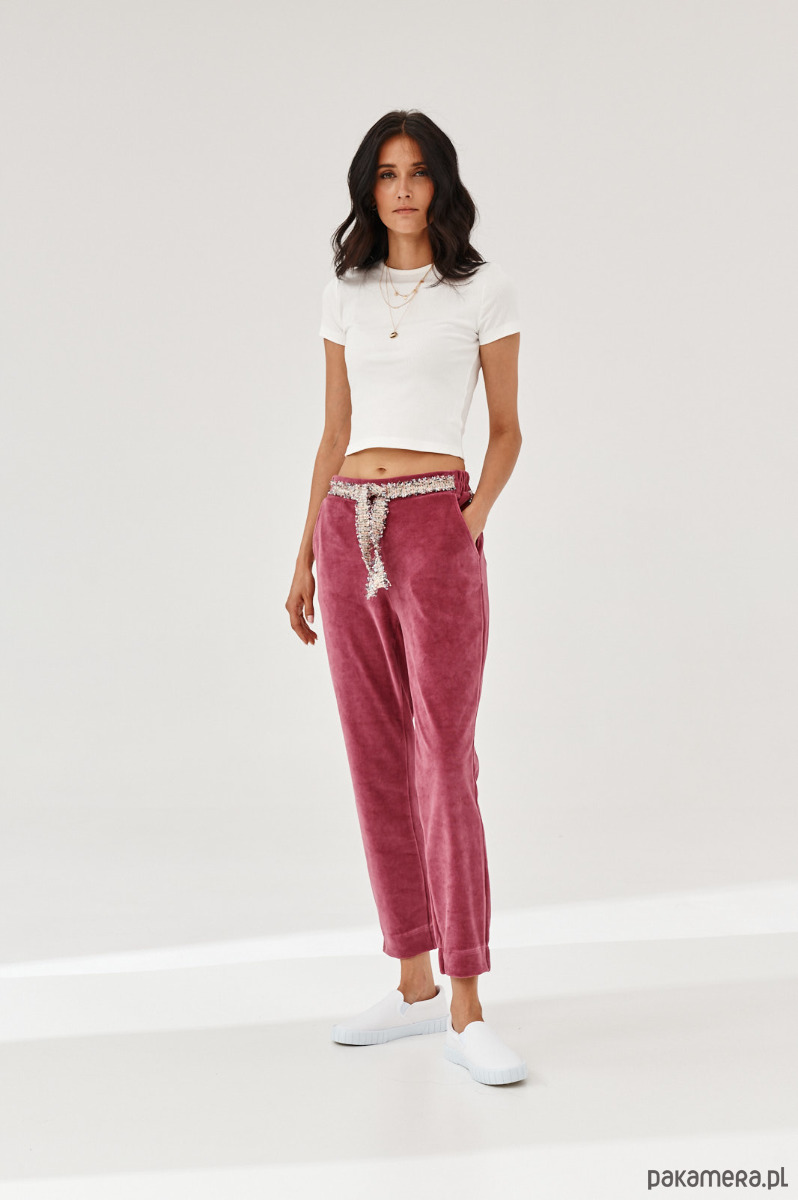 Spodnie ALDO uszyte z miękkiej dzianiny. Dzianina to połączenie bawełny z elastanem, która posiada certyfikat OEKO-TEX. Spodnie mają kieszenie z naszytą ozdobną taśmą. W talii na tyle jest guma. Dół nogawek z przodu jest prosty, na tyle ma wszytą delikatną gumę. Na przodzie na pasku naszyta ozdobna taśma. Taśma typu bucle ze złotymi akcentami. Bluza do kupienia również w sklepie.