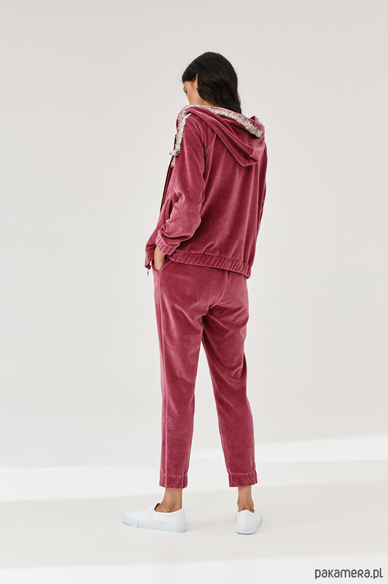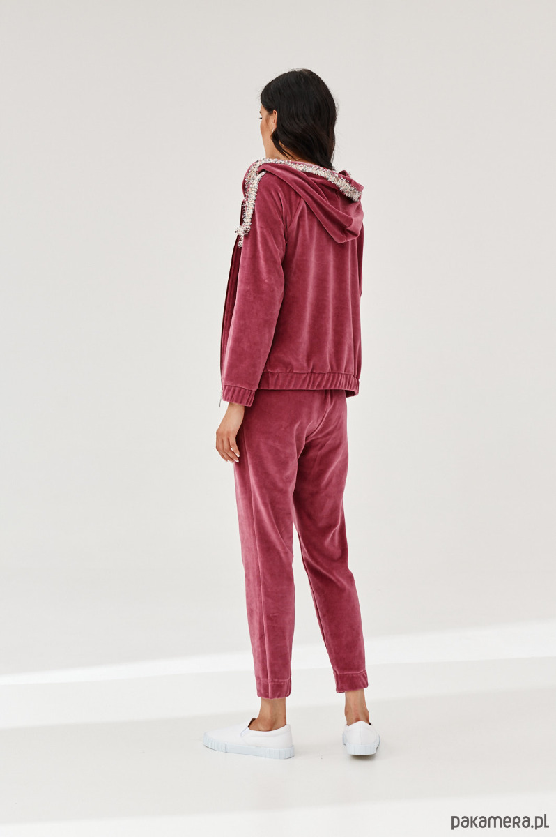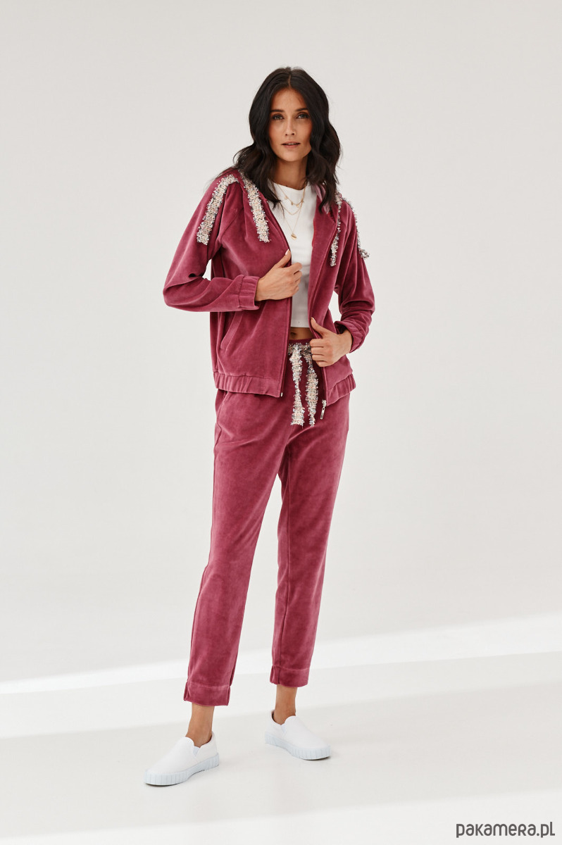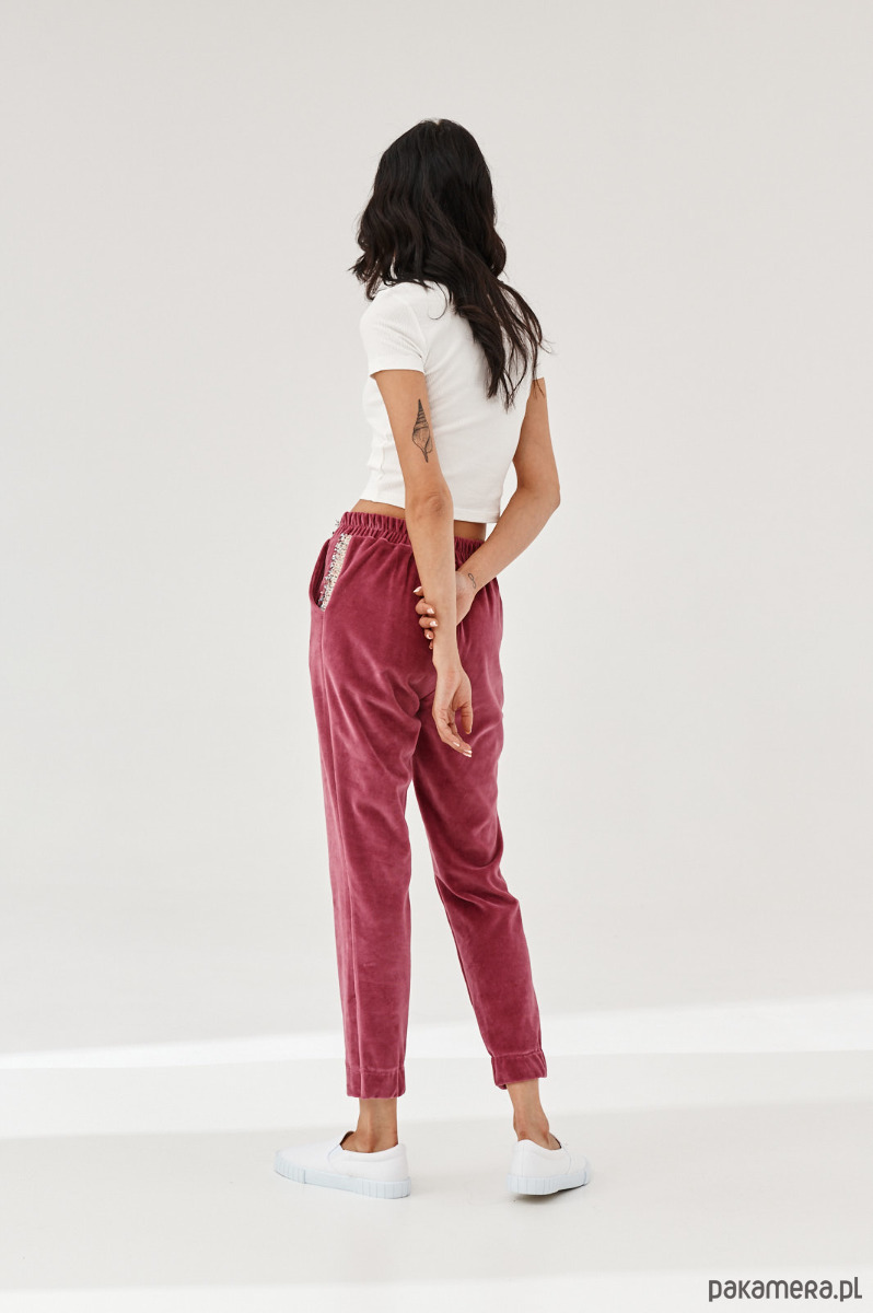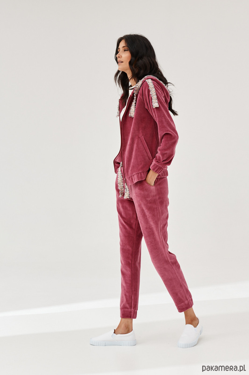 Spodnie ALDO uszyte z miękkiej dzianiny. Dzianina to połączenie bawełny z elastanem, która posiada certyfikat OEKO-TEX. Spodnie mają kieszenie z naszytą ozdobną taśmą. W talii na tyle jest guma. Dół nogawek z przodu jest prosty, na tyle ma wszytą delikatną gumę. Na przodzie na pasku naszyta ozdobna taśma. Taśma typu bucle ze złotymi akcentami. Bluza do kupienia również w sklepie.